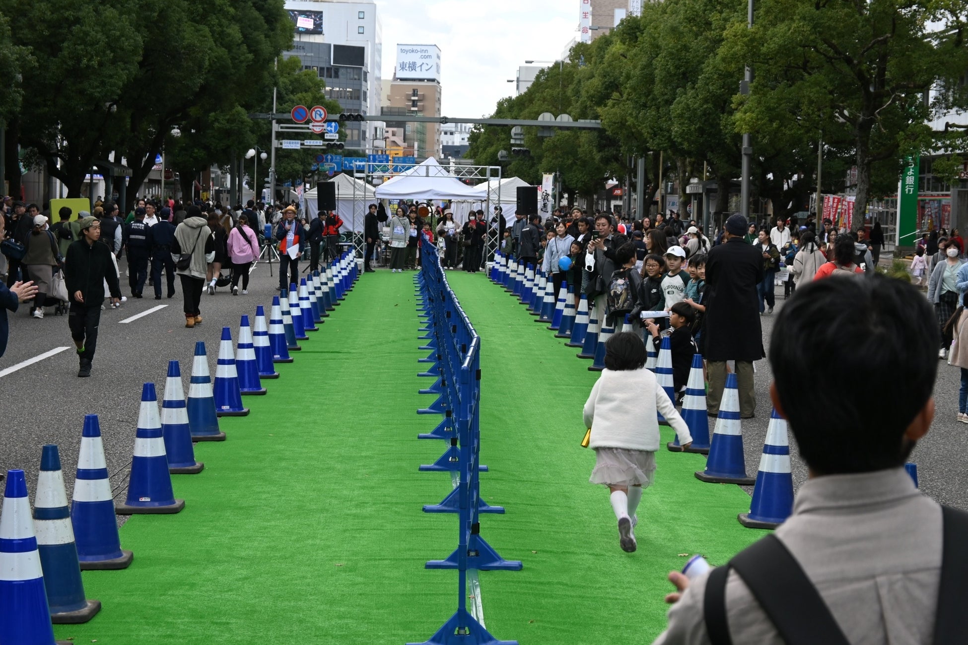 歩行者天国の中央に位置する「ミンナでお祝いエリア」には「雲海酒造 presents ミライへつなげ! 100 km バトンリレー」のコースが出現。