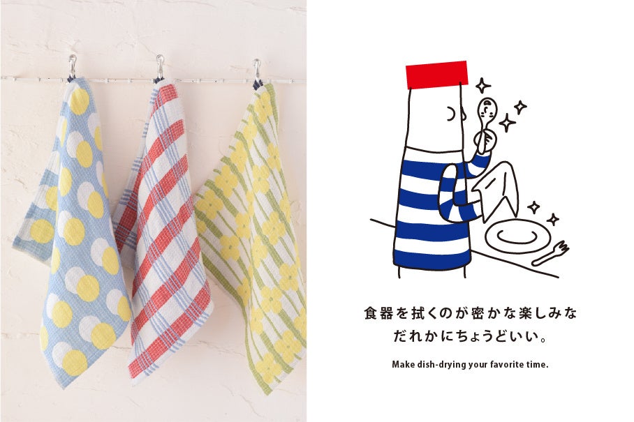 今春の展示会で大きな反響があった、今治ならではのジャカード織りを駆使したふきん。デザイン性あふれる21種類の柄をワッフル織で表現。デザインはもちろん、何より大切にしているのは、「買ったその日から、しっかり水を吸う」という確かなふきんとしての使い心地。使い始めから実感できる吸水力と、ワッフル織特有の心地よい質感をぜひ体感してください。