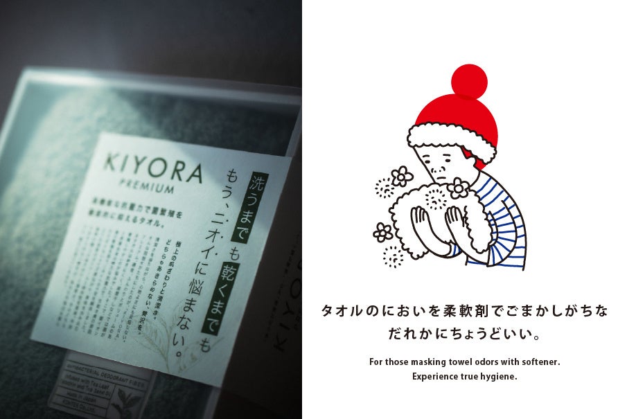 クラファンサイトMakuakeで最終3,400%の支援を達成した注目シリーズ。タオルそのものが菌を減らし続けるというコンセプトのもと高い抗菌防臭機能と、贅沢なボリューム・肌触りも両立。商品ごとにサイズ設計まで考え抜かれた、これまでにない特化型タオル。清潔さというシリーズ共通の機能をベースに、贅沢なボリュームで部屋干し臭にとにかく強い、『KIYORA プレミアム』、肌への摩擦を抑えることに特化した “擦らせない”『KIYORA スキンケア』の2種がある。