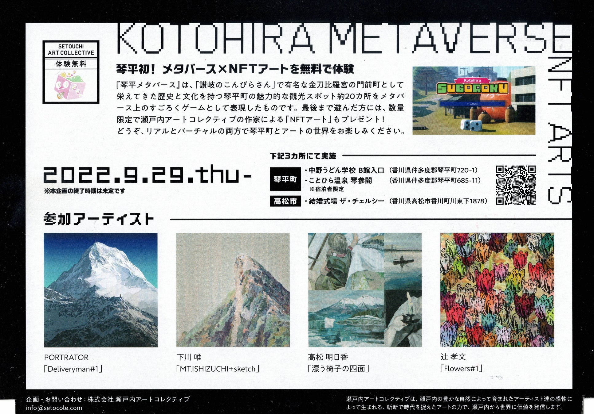 瀬戸内アートコレクティブは現代アートティストを育てネットワークを活かす取り組みを行っていおり、今回”琴平メタバース”を企画しています。島で展開しているアートから街へ展開していくのが周遊事業ですが、私たちはさらにデジタル上で展開することを目的としています。コロナ禍や遠方、身体不自由な方にお越しいただくことが難しいため、メタバースの世界で見せていくことで、いろんな方に関わってほしいという背景で始めています。この企画は琴平町の観光スポット約20ヶ所マッピングして、すごろくのようなゲームをしていただくことで街を巡れるような仕組み作りをし、最後まで行った方の中からNFTアートをプレゼントするという企画もつけています。若手のアートをNFTで配信することで、アーティストの価値を広げられるなど、いろんな形で相乗効果がでるような企画にもなっています。秋会期は琴平エリアでは中野うどん学校や琴参閣で、高松エリアはザ・チェルシーで体験可能ですので、是非行ってみてほしいです。