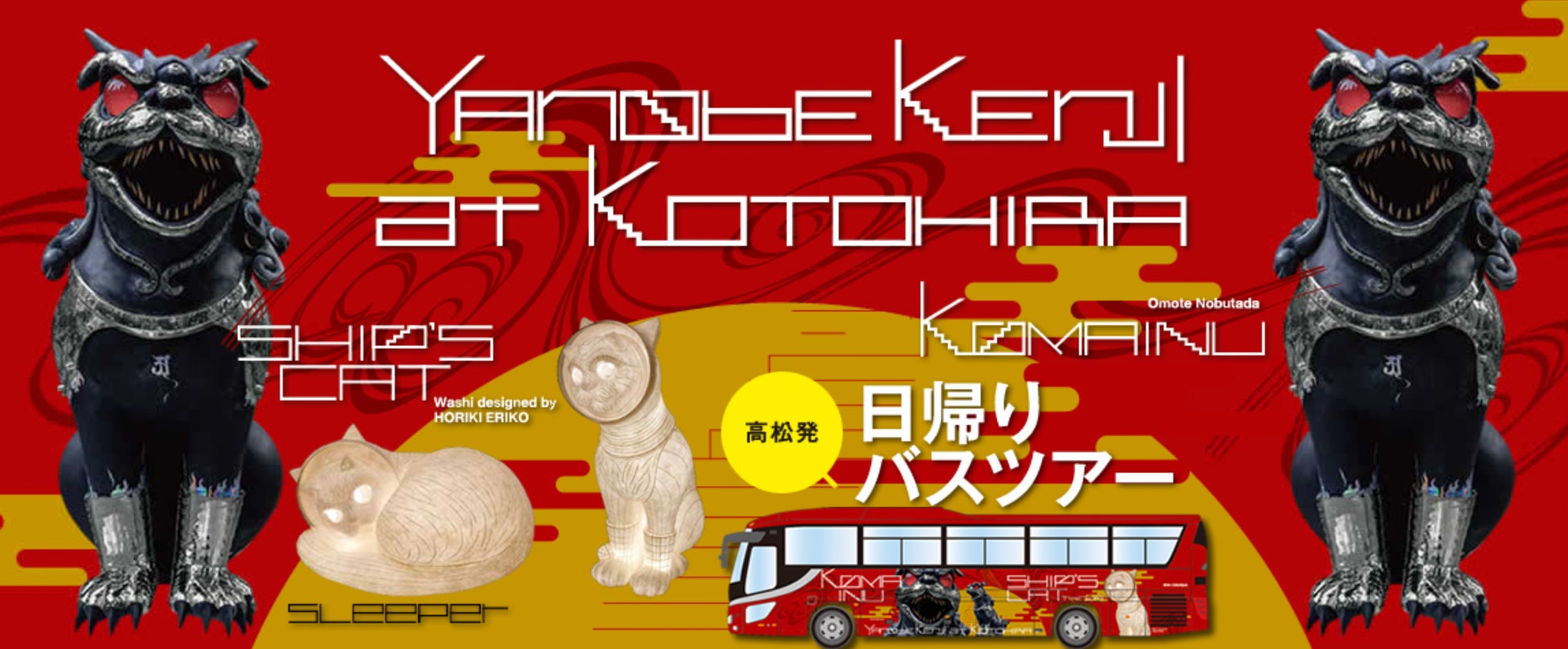 本イベントのおいでまい祝祭に協力しているWeBase 高松 ホテルとは2018年のオープンした時からパブリックアートでもご一緒し、旅の守り神「SHIP’S CAT」をテーマにデザインした見返り猫「SHIP’S CAT(Returns)」を制作しました。今回エリア拡大となる琴平の金刀比羅宮で奉納展示される”KOMAINU”と和紙で作られた”SHIP’S CAT”が描かれ、とても力強いラッピングバスとなりました。香川県の高松と琴平をつなぐバスツアーを楽しんでいただきたいと思います。