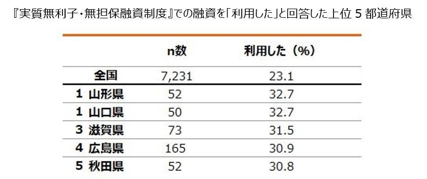 - 中小企業経営者の2割超(23.1%)が『実質無利子・無担保融資制度』を「利用した」と回答。融資を受けた金融機関は「政府系金融機関」が最も多く半数以上(52.1%)。