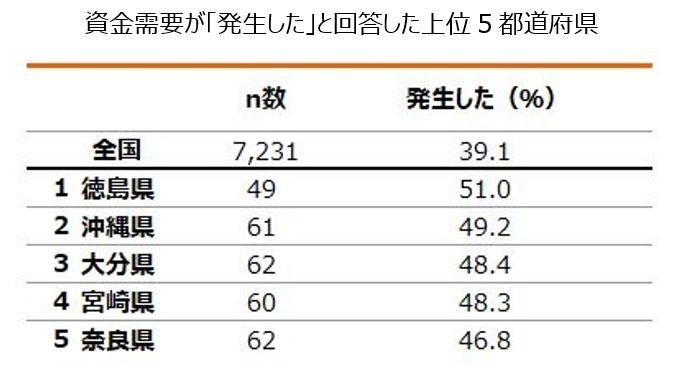 また、資金需要が「発生した」の回答率を都道府県別に見ると、徳島県が最も高く(51.0%)、次いで沖縄県(49.2%)、大分県(48.4%)でした。