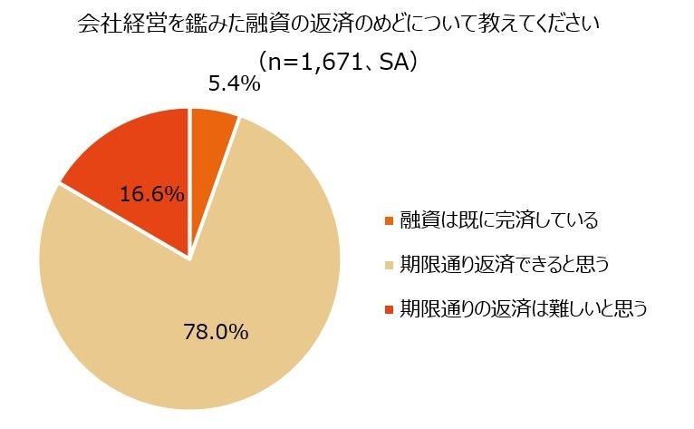 - 『実質無利子・無担保融資制度』の用途は、「人件費や家賃など固定費の支払い」(48.0%)や「売上補填」(43.8%)。返済のめどについては、約8割(78.0%)が「期限通り返済できると思う」と回答の一方で、16.6%が「期限通りの返済は難しいと思う」と回答。