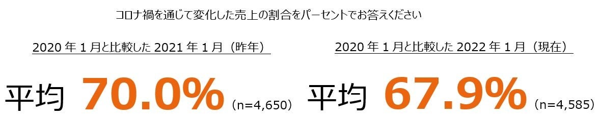 また、売上が「増えた」「減った」と回答した4,650名(昨年)と4,585名(現在)に、売上が変化した割合について聞いたところ、昨年1月(平均70.0%)と今年1月現在(平均67.9%)どちらも、コロナ禍以前の2020年1月の約7割でした。
