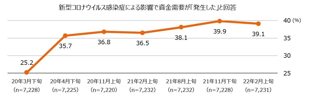 - 新型コロナウイルス感染症による影響で会社の資金需要が「発生した」のは39.1%で、前回調査(2021年11月上旬に実施)からほぼ横ばい。