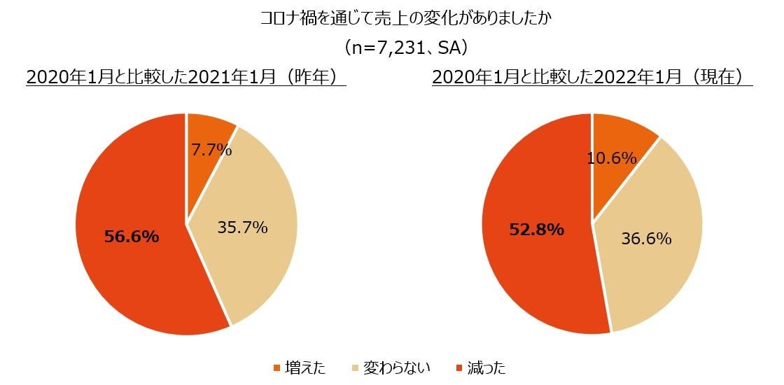 中小企業経営者7,231名に、コロナ禍以前の2020年1月と比較した売上の変化について聞いたところ、昨年1月については「減った」が56.6%、と今年1月現在は「減った」が52.8%となり、どちらも「減った」と回答した割合が多い結果となりました。なお、その割合を比較すると、昨年よりも現在のほうがやや少ない(-3.8ポイント)結果となりました。