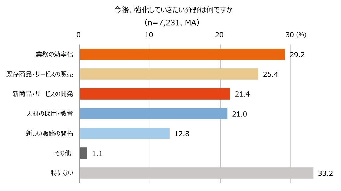 - 中小企業経営者が今後強化していきたい分野は「業務の効率化」(29.2%)が最も多く、次いで、「既存商品・サービスの販売」(25.4%)。