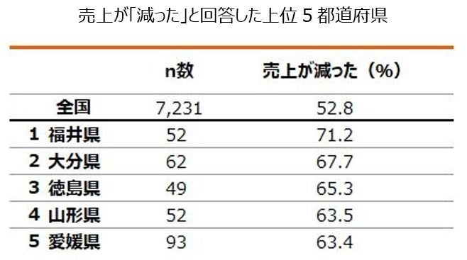 2020年1月と比較した現在(2022年1月)の売上が「減った」の回答率を都道府県別に見ると、福井県が最も高く(71.2%)、次いで大分県(67.7%)、徳島県(65.3%)でした。