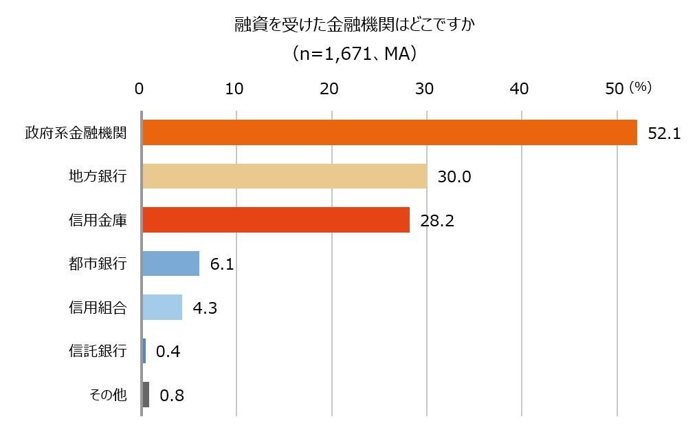 また、「利用した」と回答した1,671名に、融資を受けた金融機関はどこか聞いたところ、半数以上(52.1%)が「政府系金融機関」と回答し最も多い結果となりました。次いで、それぞれ約3割で「地方銀行」(30.0%)、「信用金庫」(28.2%)でした。