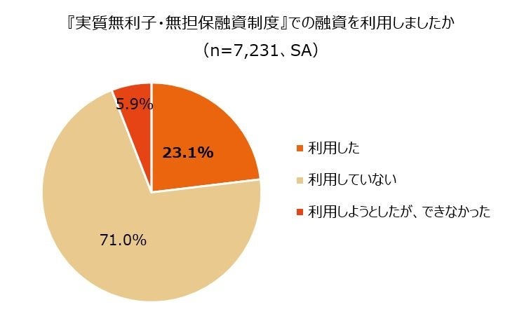 中小企業経営者7,231名に、新型コロナウイルス感染症による影響を鑑みて2020年5月より実質的な利子がなく、無担保で設備資金・運転資金の融資を受けられる『実質無利子・無担保融資制度』での融資を利用したか聞いたところ、「利用した」と回答したのは23.1%でした。