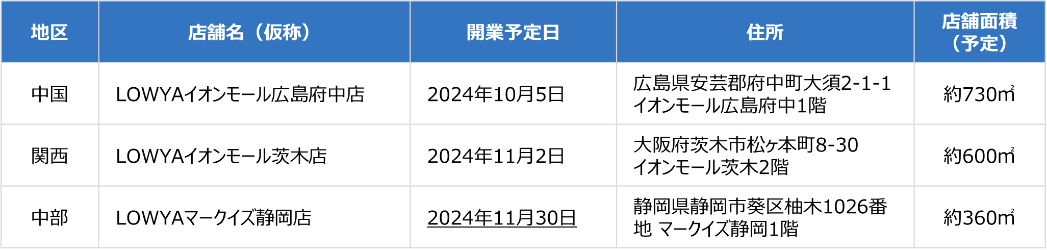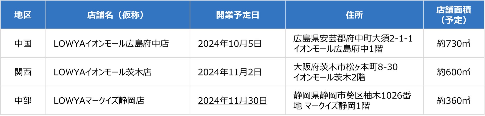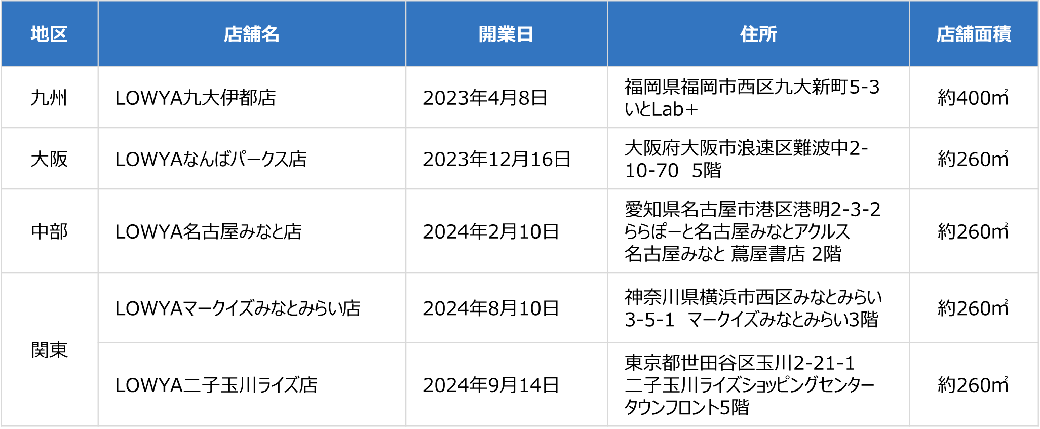 2023年4月には、1号店となる「LOWYA九大伊都店」をブランド誕生の地である九州に開業。同年12月には大阪のなんばに2号店、2024年2月には名古屋に3号店、8月には横浜に4号店をオープンいたしました。