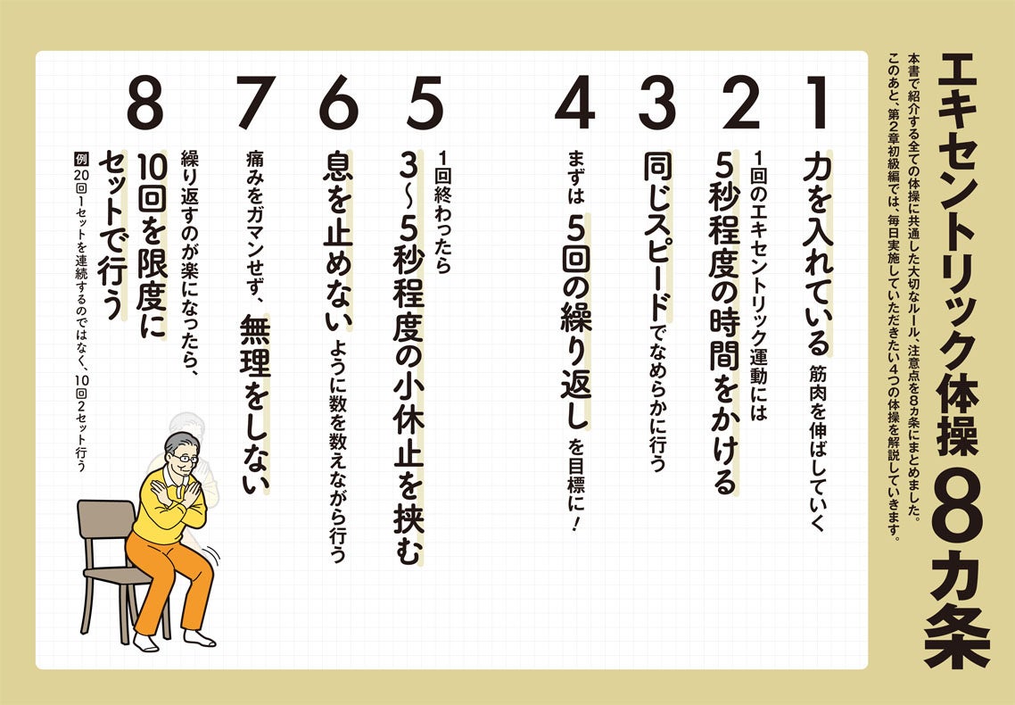 エキセントリック体操の特徴は今までの体操・運動・トレーニングの約半分の動きで高い効果を得られる点にあり、体力に自信のない方や運動が苦手な方の健康づくり・体力づくりに貢献します。これまでの約半分の動き、言い換えると「楽」な動きで高い効果が得られることは、運動を継続するために重要な要素となります。飽食や運動不足の影響により、健康が害されることもある現代において、10年先、20年先にも元気で健康な身体を維持していくために、高齢者の方はもちろん、高齢者のご家族の方などにも本書が役立てられることを願っています。