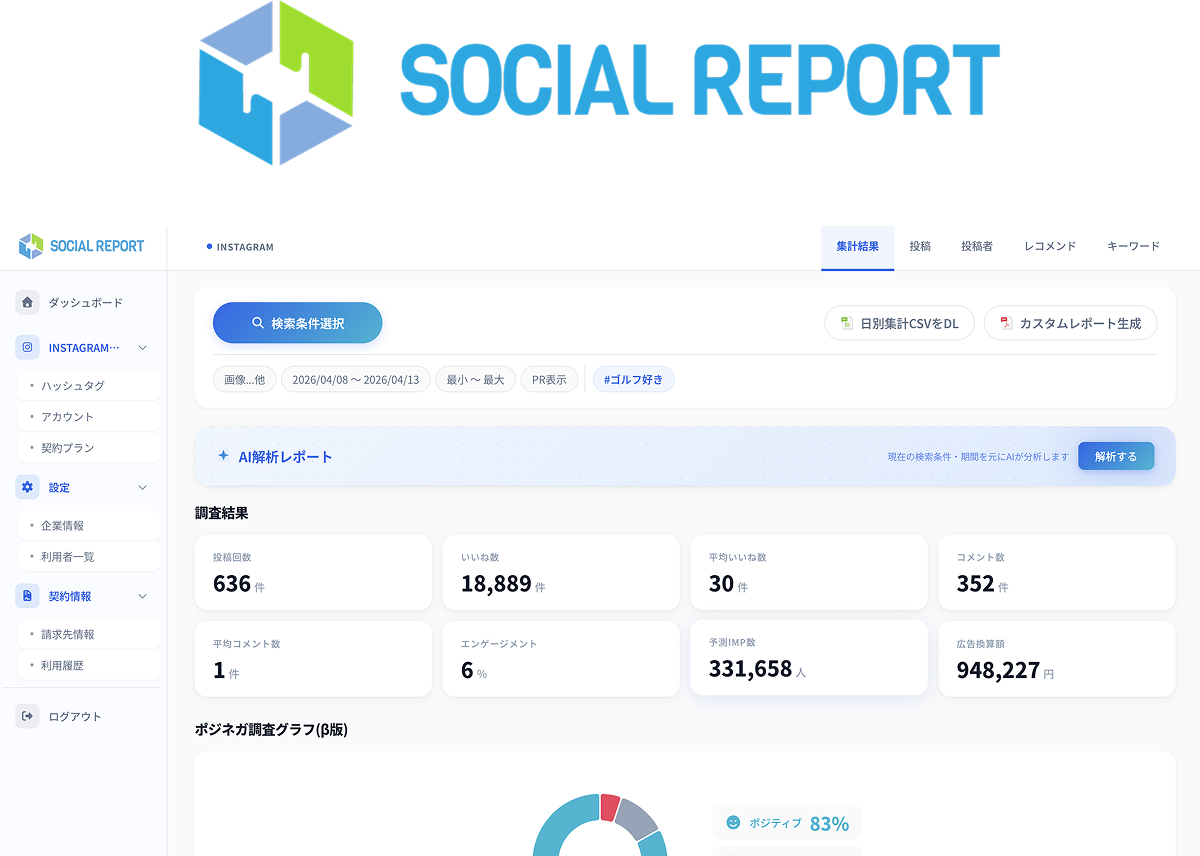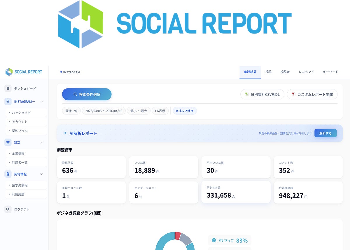 Instagram分析SaaS「hashout」を運営する株式会社hashout(本社:東京都豊島区/代表:落合匠)は、サービス名を「Social Report」に改め、管理画面を全面リニューアルしました。2,000社以上への導入を通じて蓄積したユーザーの声を軸に設計を根本から見直し、2026年4月15日より新バージョンの提供を開始します。