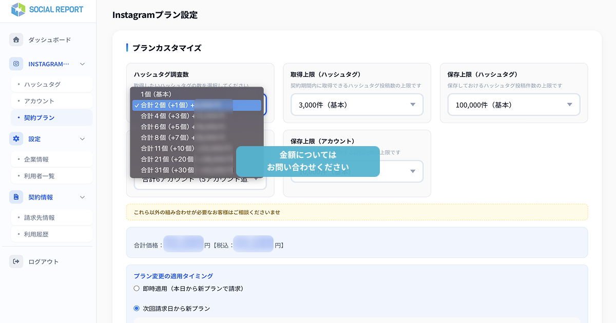 今回のリニューアルにあわせて、価格体系も見直しました。これまでは固定のプランから選ぶ形でしたが、新プランではハッシュタグ数・アカウント数などを顧客自身が必要な量に応じて組み合わせられる設計に変更しています。「使う機能だけ払う」という現場の感覚に合った価格設計です。