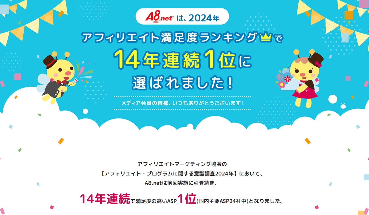 A8.net ASP満足度1位14年連続受賞記念ページ:https://support.a8.net/as/camp/asp2024/