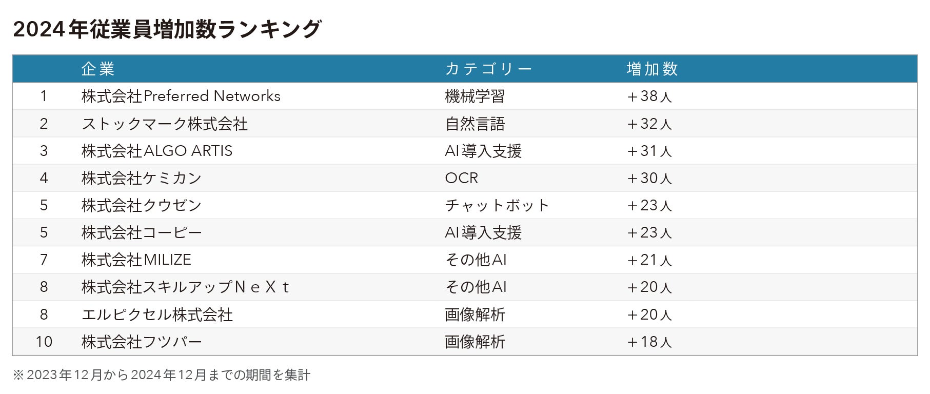 AI分野スタートアップ 従業員増加数ランキング(2024年)
