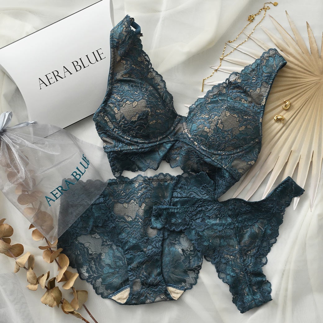 貝殻のような花柄が大胆に広がったレースが特徴的なシェルフラワーシリーズより、7周年を記念して限定カラー“ピーコックブルー”が登場。