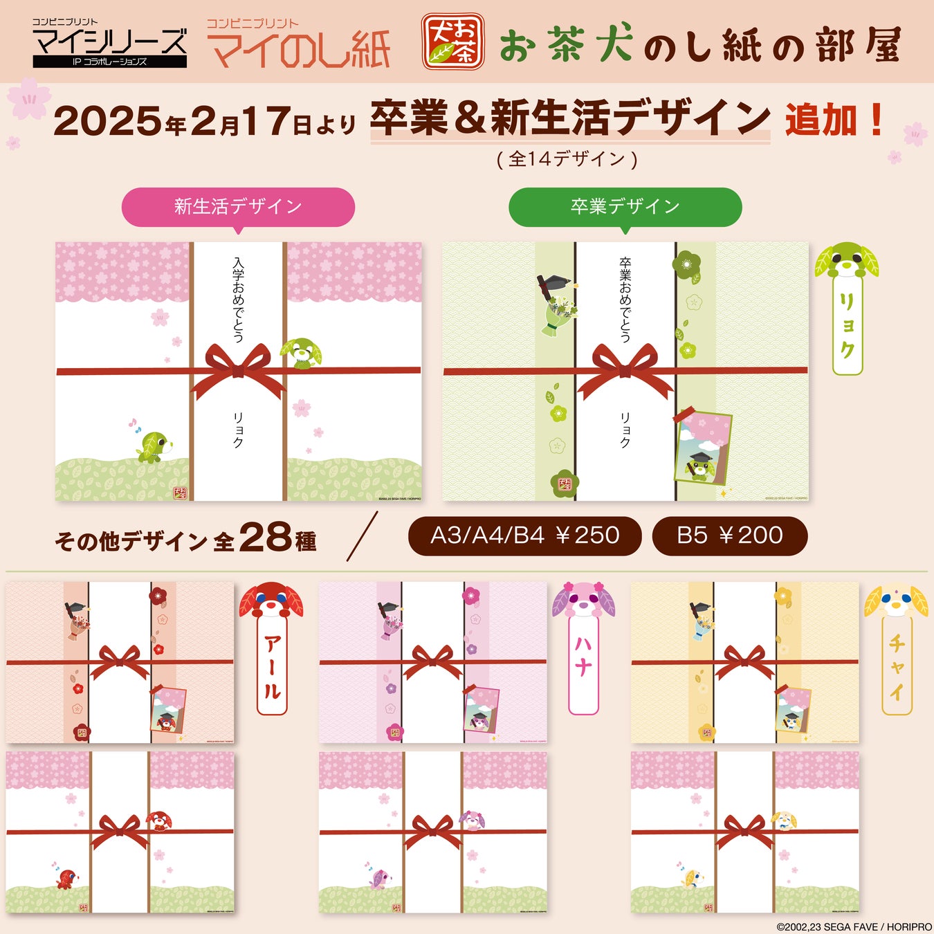 株式会社サムライソード(本社:東京都豊島区、代表取締役:比企良公)は、全国のコンビニ約58,000店舗で利用可能な「のし紙」プリントサービス『マイのし紙』と、「宛名シール」プリントサービス『マイ宛名シール』の「お茶犬コラボ」に、卒業デザイン&新生活デザインをそれぞれ追加し2025年2月17日(月)より提供開始いたしました。