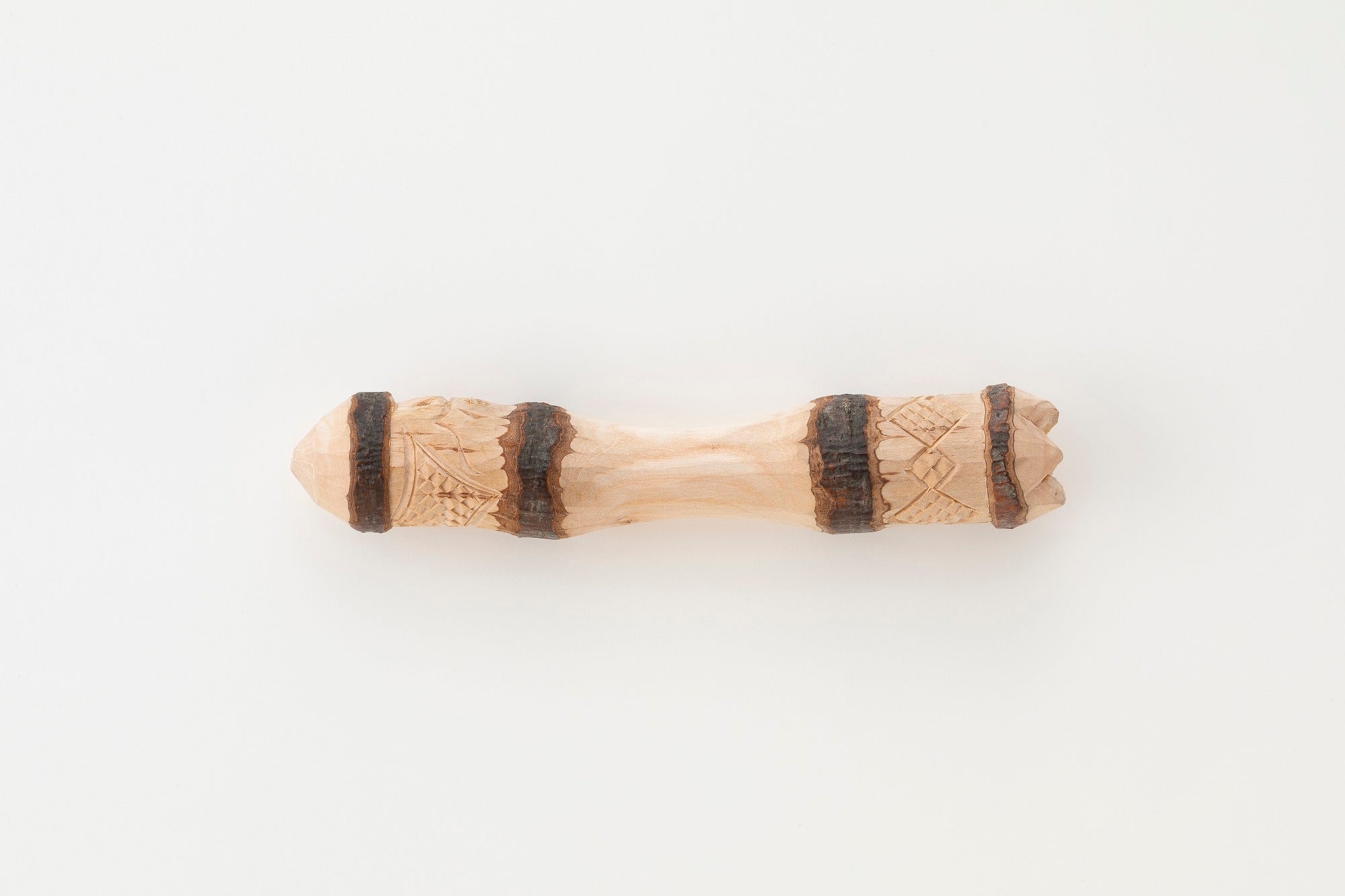 持ち手にアイヌ文様を木彫で施した、パスイのような靴べら