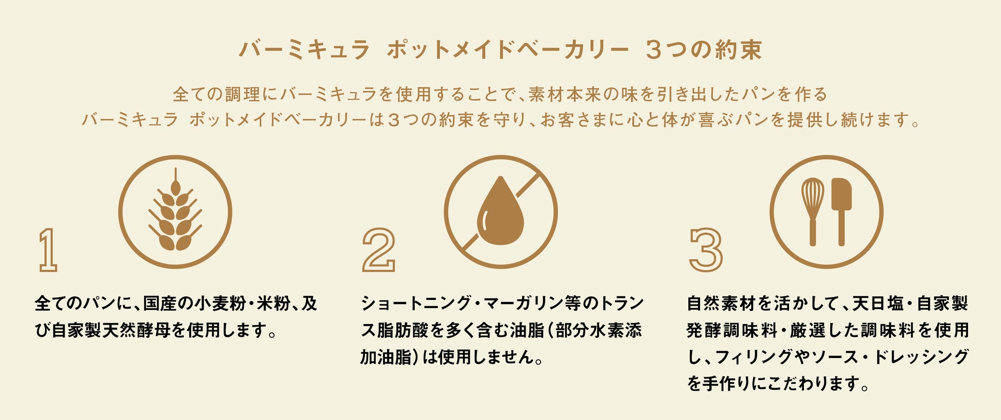 全てのパンをバーミキュラの鋳物ホーロー製調理器具で焼き上げる「バーミキュラ ポットメイドベーカリー」は、おかげさまでたくさんのお客様にご支持いただき、バーミキュラ ビレッジ本店・名古屋三越星ヶ丘店・ジェイアール名古屋タカシマヤ店と名古屋市内に3店舗を構えるベーカリーになりました。たくさんのお客様に愛されるベーカリーになった開業5周年の節目に、“心と体が喜ぶバーミキュラ料理”をコンセプトに生まれ変わります。より安心・安全にお楽しみいただけるベーカリーを目指し、お客様と3つの約束をいたします。