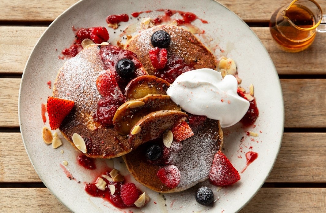 バーミキュラの特製パンケーキグリドル(鉄板)で香ばしく焼き上げた全粒粉のパンケーキは、表面はサクっと中はふわっと。生地にはバターを使用せず、ホイップクリームは豆乳とココナッツを使用するなど、おいしさと健康にこだわりました。