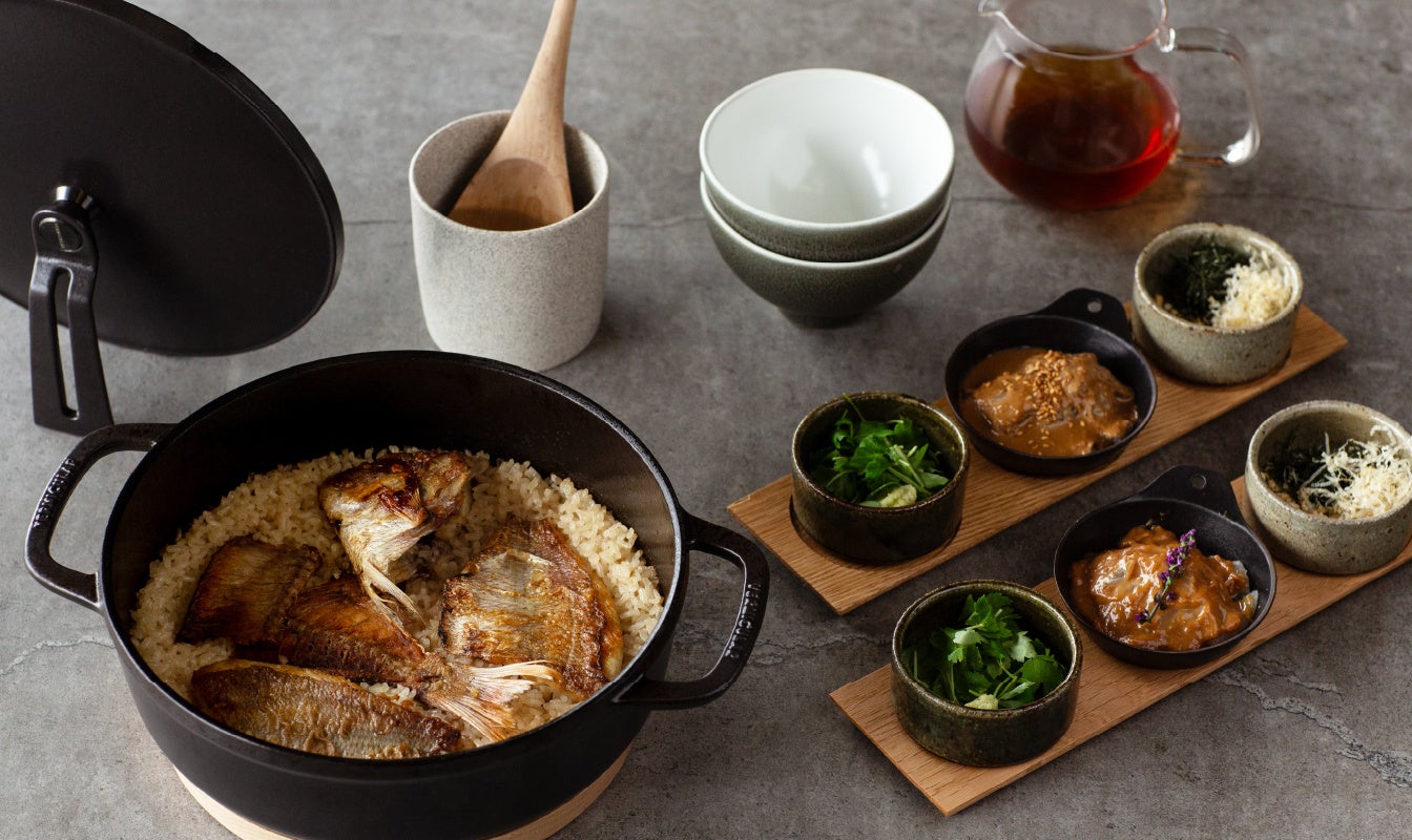 鍋で鯛を香ばしく焼いて旨みを凝縮し、丸ごと炊き上げた香り高い鯛めしです。まずは、そのままお召し上がりいただき、二口目はあつあつの鯛めしに特製だれに漬け込んだ鯛のお刺身をのせて、〆には鯛茶漬けとして3度楽しめます。