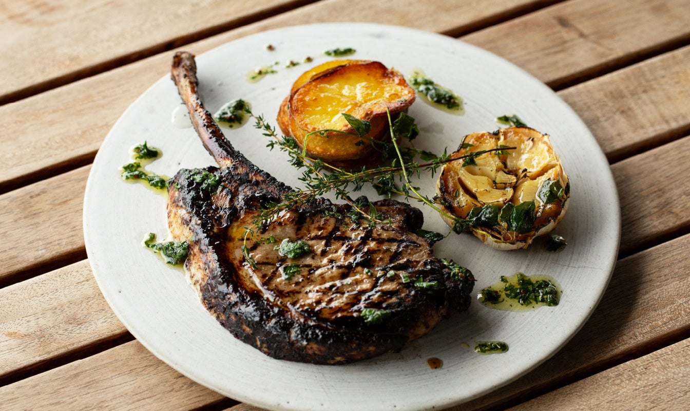自家製塩麴・ニンニク・ハーブで漬け込んだ骨付き豚ロースをライスポットで低温調理し、薪火で豪快に仕上げるステーキ。薪の薫りと香ばしさが、肉のうまみを一層引き立てます。