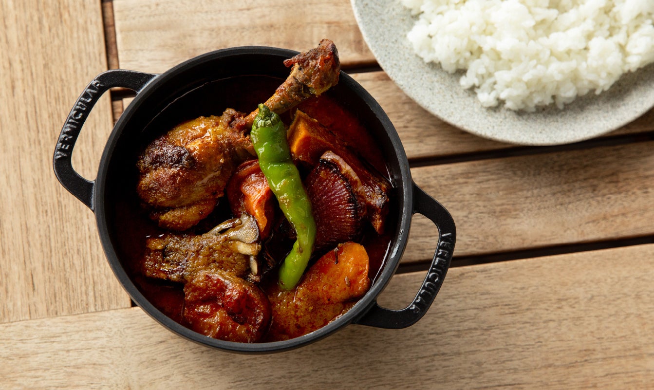 スパイスに漬け込んだ骨付き鶏もも肉とお野菜をじっくり無水調理。うま味が溶け出たスープは、最後の一滴まで飲み干せる優しい味わいです。季節野菜と共にお召し上がりください。