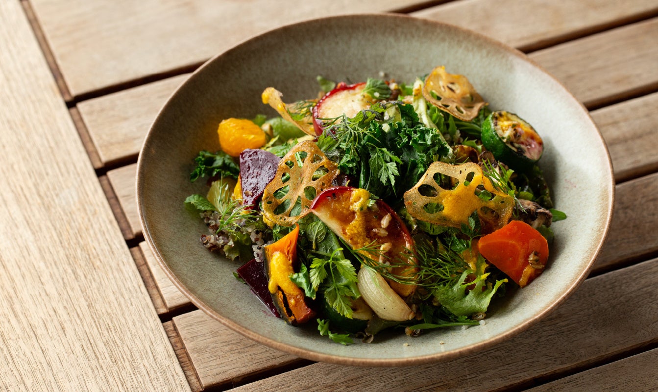 20品目以上の野菜・フルーツ・ハーブ・ナッツ・穀物が入ったボリューム満点のサラダ。葉野菜は香ばしくソテーし、根菜は無水調理で甘みを引き出し、自家製にんじんドレッシングで仕上げました。