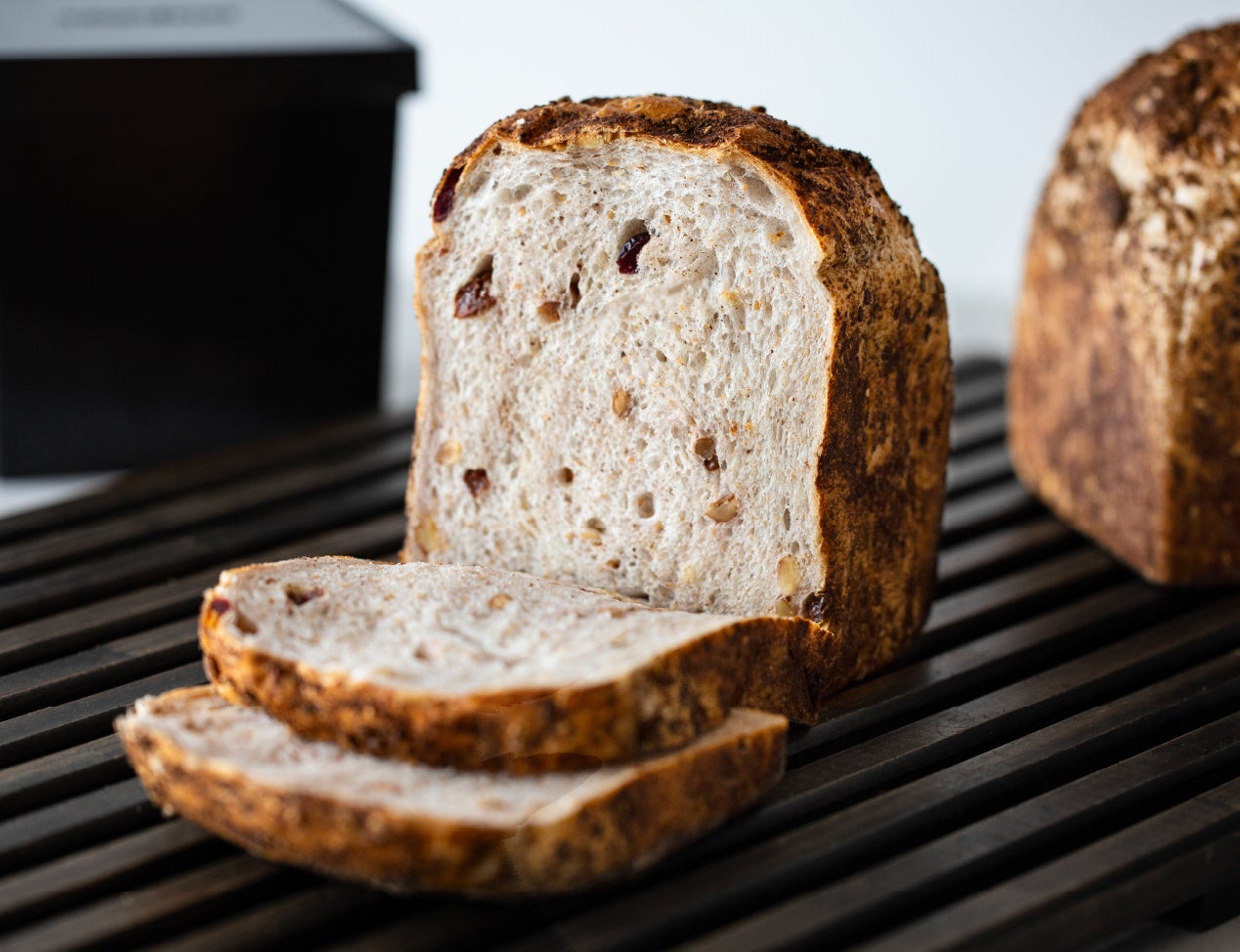 穀物をたっぷり練り込んだ生地を、バーミキュラの鋳物ホーロー製の食パン型で焼き上げました。