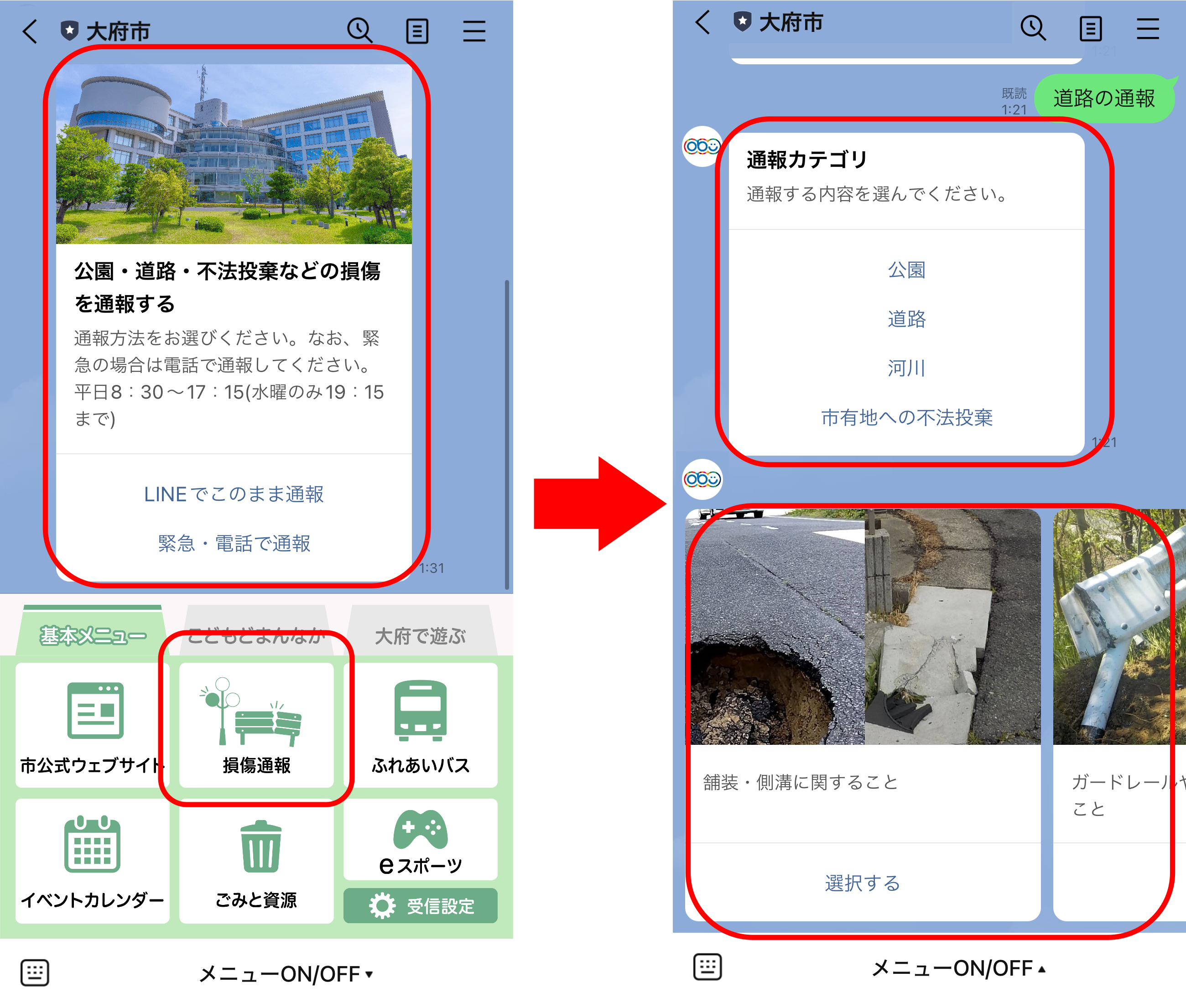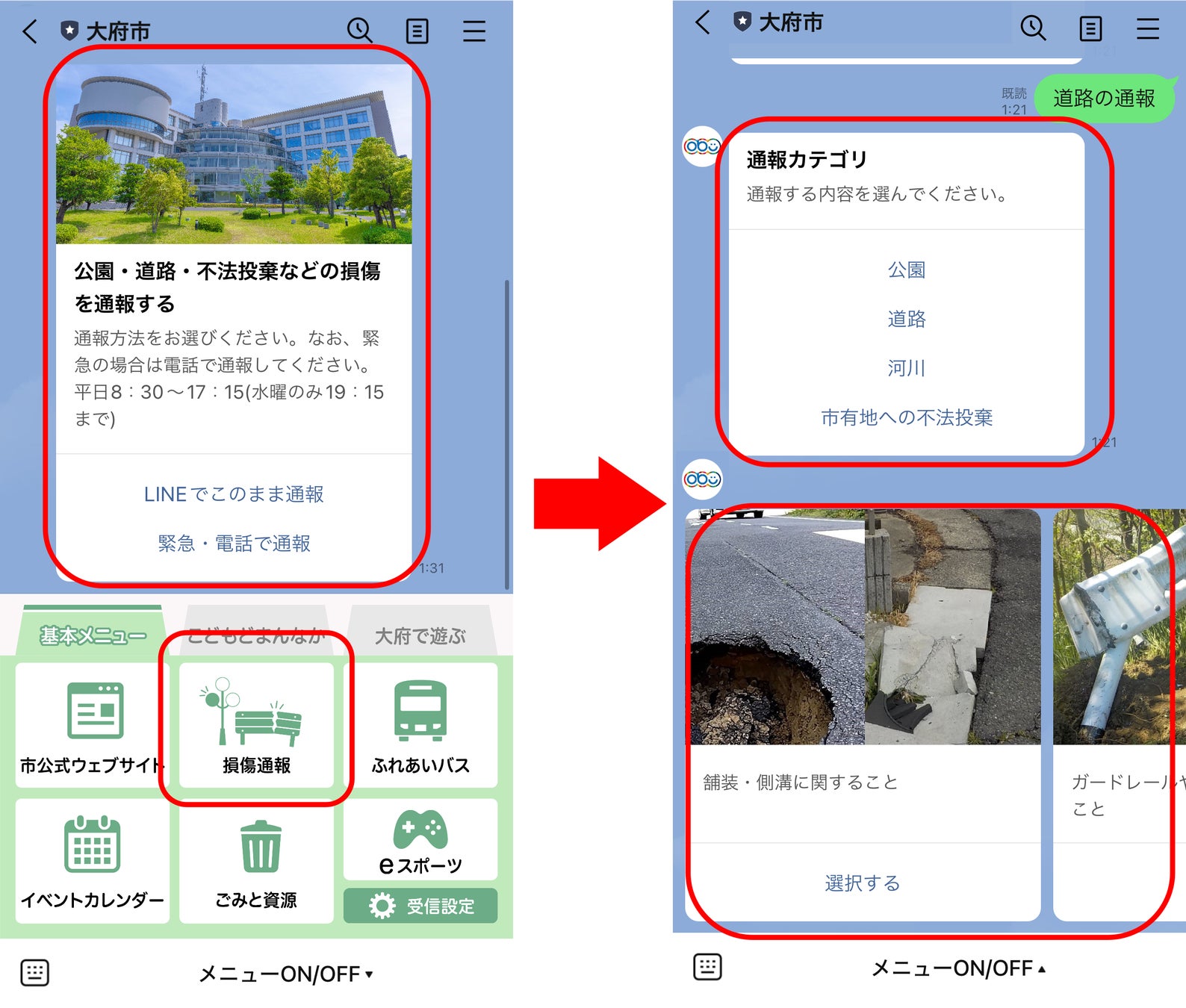 公園や道路、河川、不法投棄などの報告が可能な「通報機能」を導入。住民はチャットボットの案内に従って簡単に損傷や不法投棄の状況を報告することが可能です。