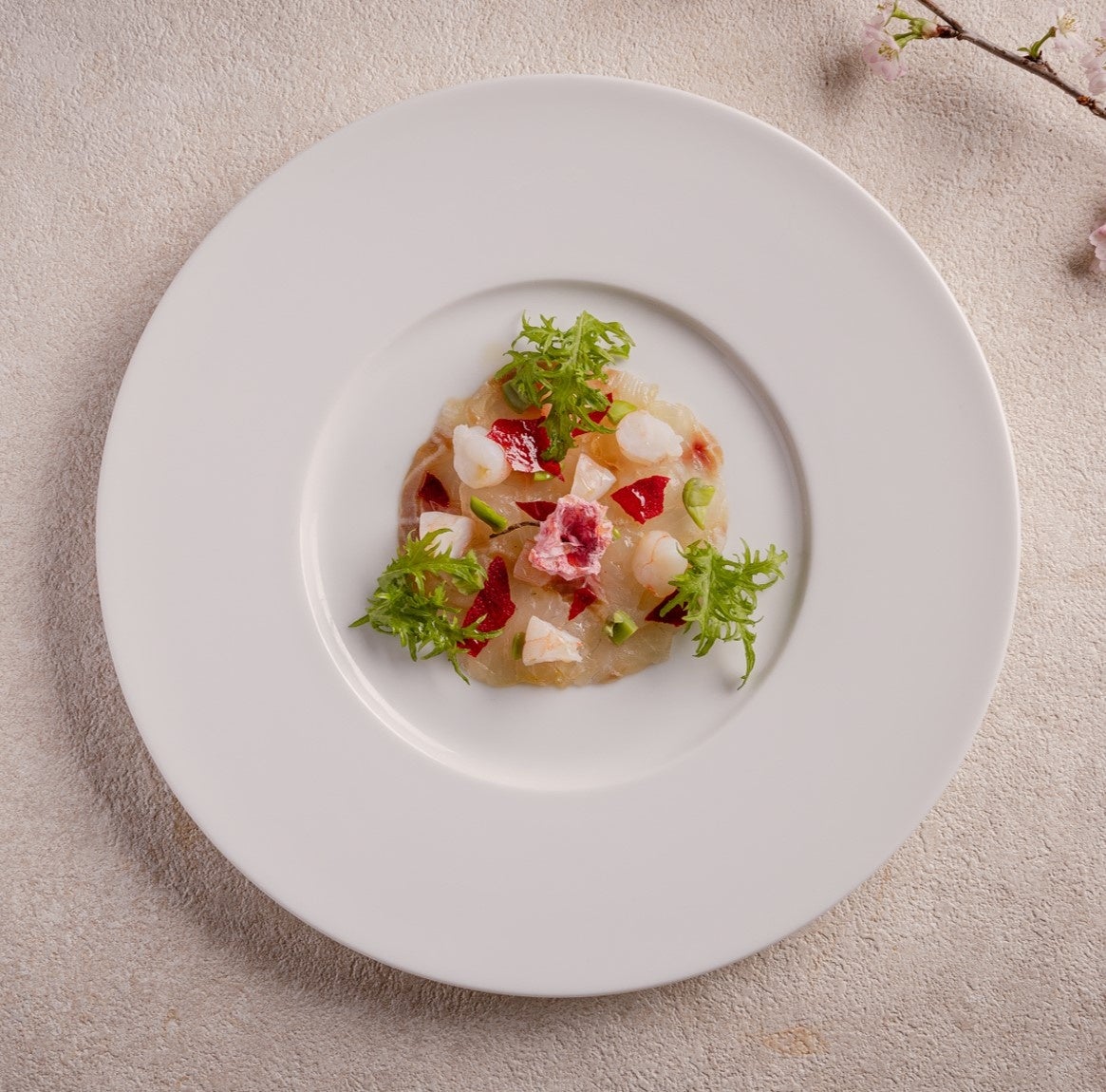 桜鯛のカルパッチョ、小海老と天豆