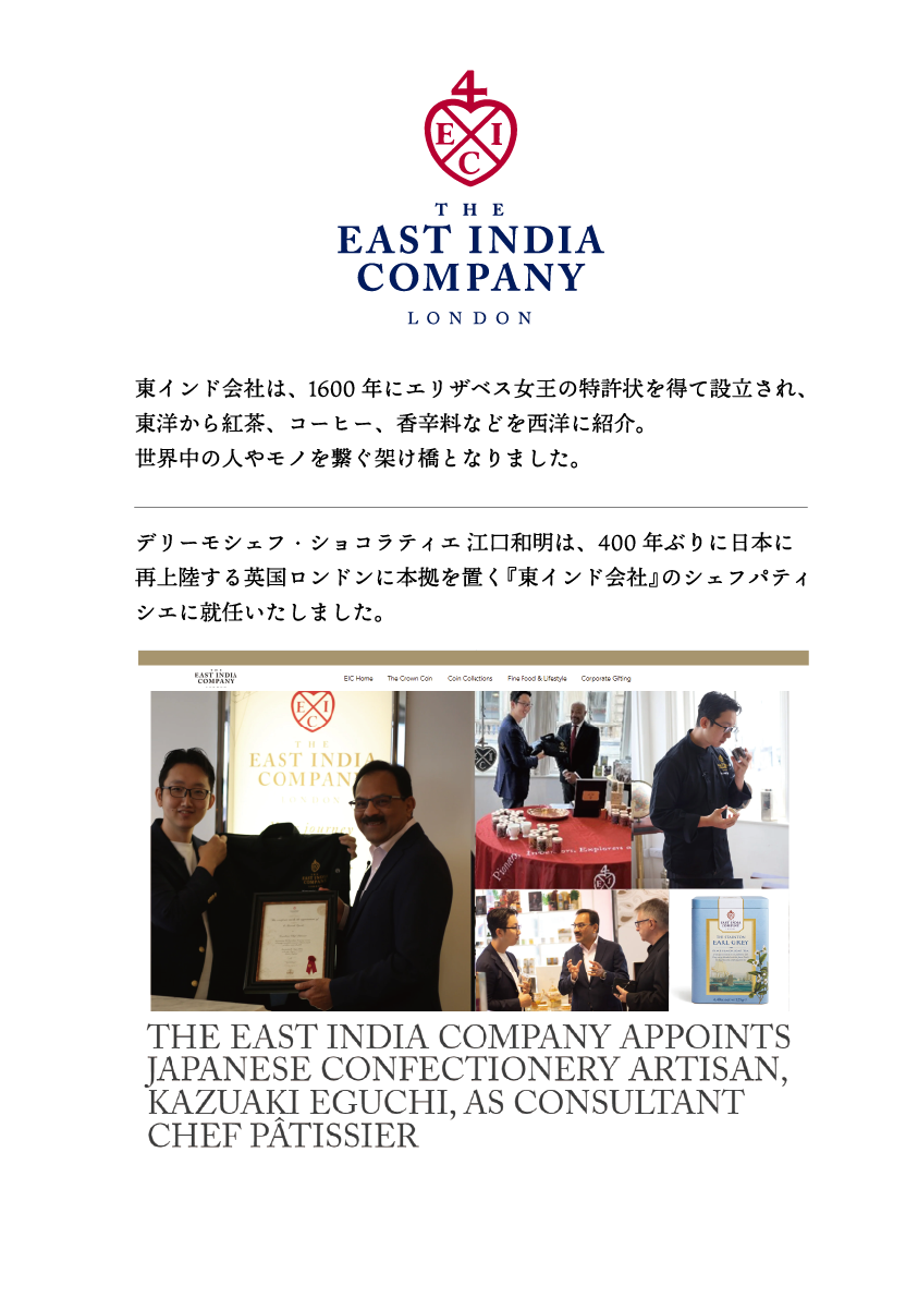 英国・ロンドンで江口和明とラリース・レナドラ氏とのコラボレーションの結実として、4種類のマスターブレンドが出来上がりました。何度も何度も試飲して、レナドラ氏のティーマスターとしての広範な紅茶の知識と、江口のパティシエ、ショコラティエとしてのクリエイティブがぶつかり合う現場でした。その結果、紅茶を愛するすべての方々へご提供するに足る、価値ある唯一のオリジナルブレンドが誕生しました。この希少なオリジナルブレンドへの返礼として、江口和明が東インド会社(The East India Company)の紅茶とのマリアージュとして新たに開発したのが、今回ご紹介する3種類のチョコレート菓子です。コラボレーションは今後、さらなるグローバル展開へ向かう予定です。