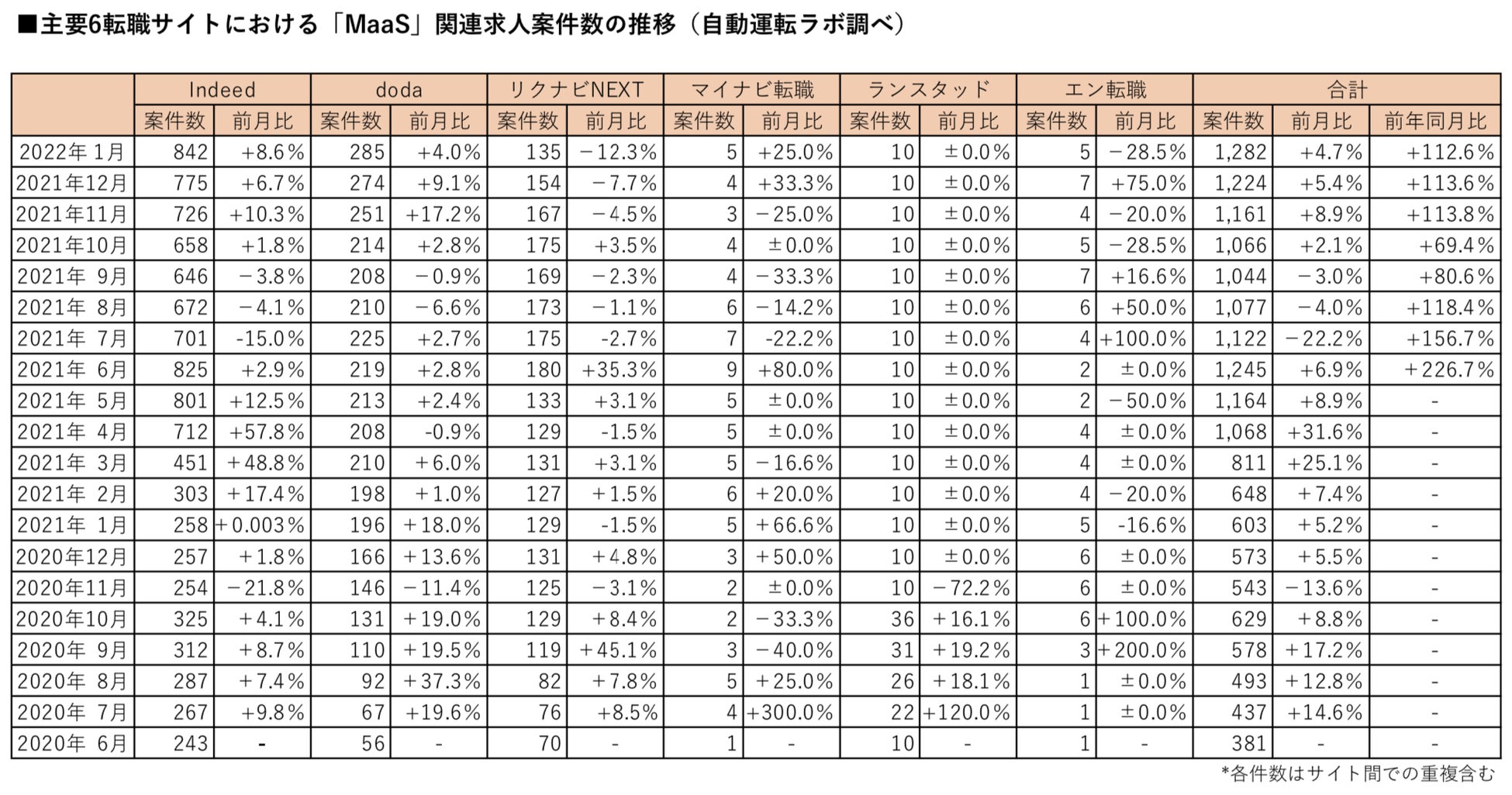 「MaaS」の関連求人案件数(主要転職6サイト)は2022年1月末時点で、前月比4.7%増、前年同月比112.6%増の1,282件となりました。前月比での増加は4カ月連続、前年同月比では3カ月連続で3桁%増を記録しています。