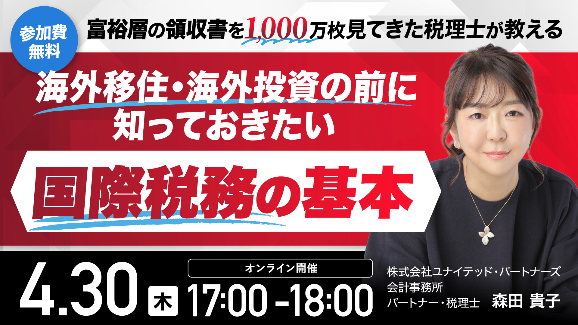 そこで本セミナーでは、国際税務の第一線で数多くの富裕層の税務を担当し、これまでに富裕層の領収書を約1,000万枚見てきたという、株式会社ユナイテッド・パートナーズ会計事務所・森田貴子税理士が登壇し、ニュースでも話題になる出国税、居住者判定、海外投資や相続の税金、CRSなど、「世界で生きる時代」に必要な税金の教養を解説します。