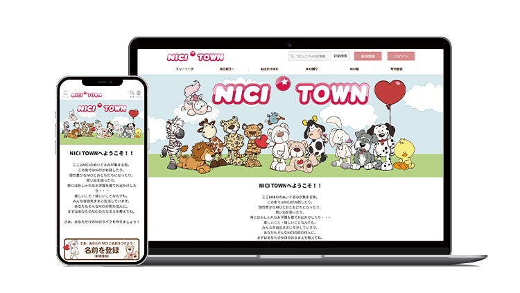 「NICI TOWN」は、自分が持っているNICIのぬいぐるみに名前を付け、お出かけ先や、1日の楽しかった出来事、服を着せた写真を発信したり、NICIになりきって会話ができるコミュニティサイトです。
