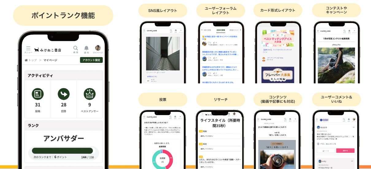 ・豊富なコミュニケーション機能をもつフォーマットをノーコードで構築できる