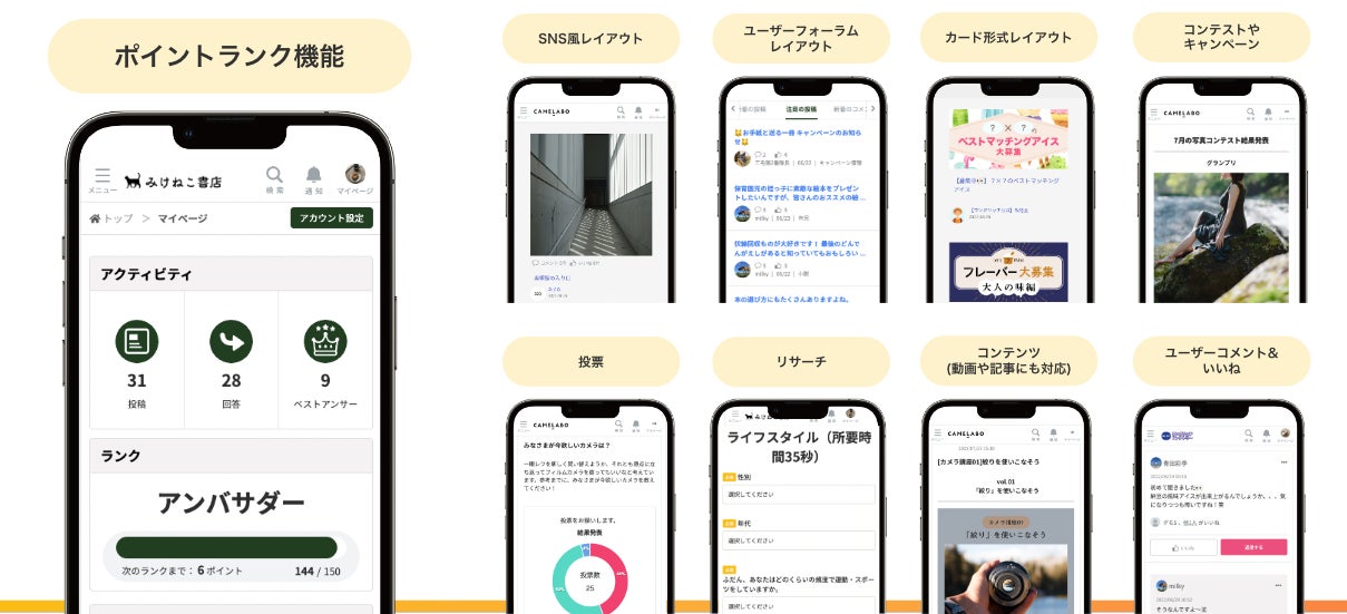 SNS風レイアウトのフォトメニューを活用し、お客様同士の交流や楽しみ方の共有を促進します。コミュニティサイトをノーコードで構築できるため、年齢や性別にかかわらず多くの方が気軽に参加しやすいUI/UXを実現できます。