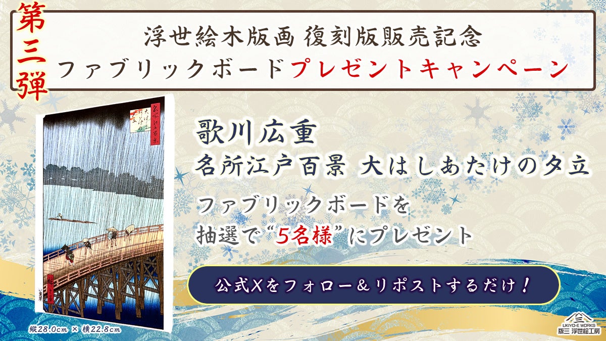 発売を記念して『版三 浮世絵工房』の公式X(旧Twitter)をフォロー・リポストしていただいた方の中から、名所江戸百景の中でも特に有名な「大はしあたけの夕立」のファブリックボードを抽選で5名様にプレゼント。シリーズの中でも屈指の名作として世界的にも評価が高く、ゴッホがこの作品を模写し、自らの油彩画に取り入れたことでも有名です。