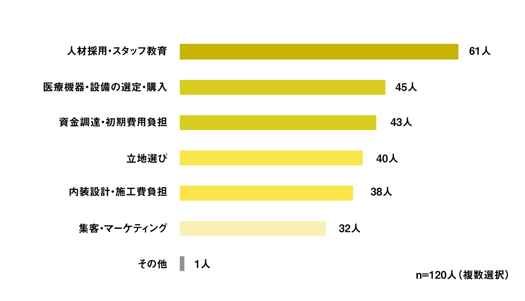 開業に際して不安に感じることを尋ねたところ、最も多かったのは、120人中約半数の61人(51%)が選択した「人材の採用・教育」でした。