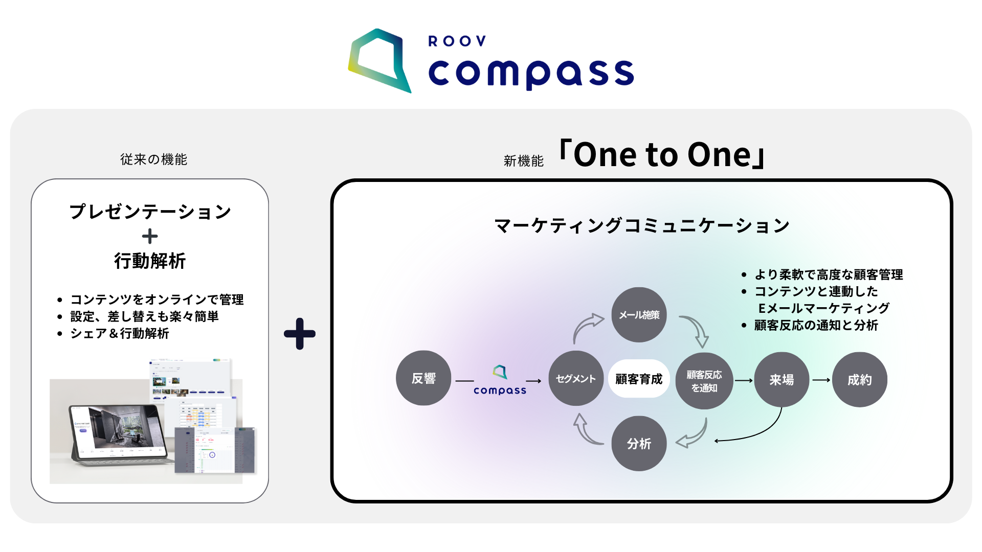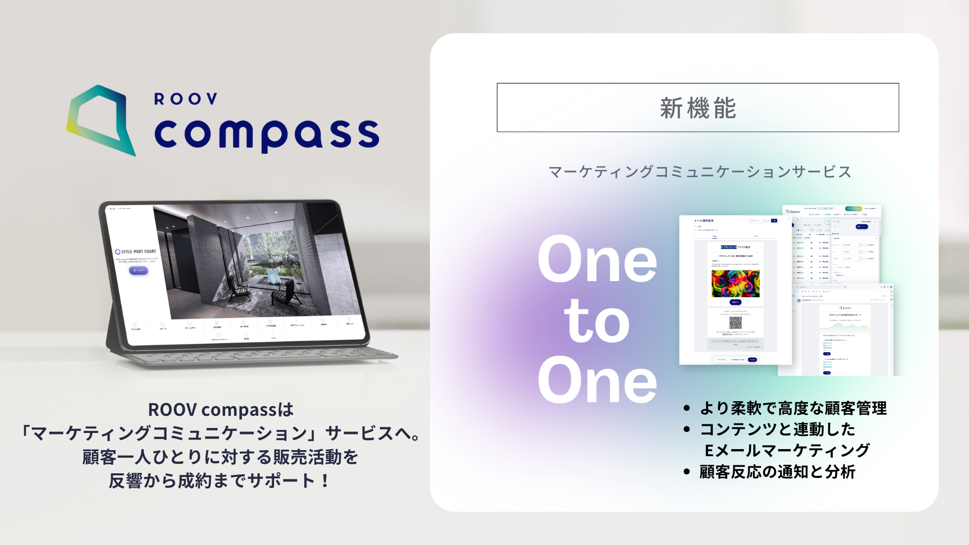 今回提供を開始する『ROOV compass』のオプションプランである「One to One」は、住宅販売員の皆様が、お客様と向き合う時間をより有効な時間にしていただくために、反響から成約までを一気通貫でサポートする新機能を満載しています。
