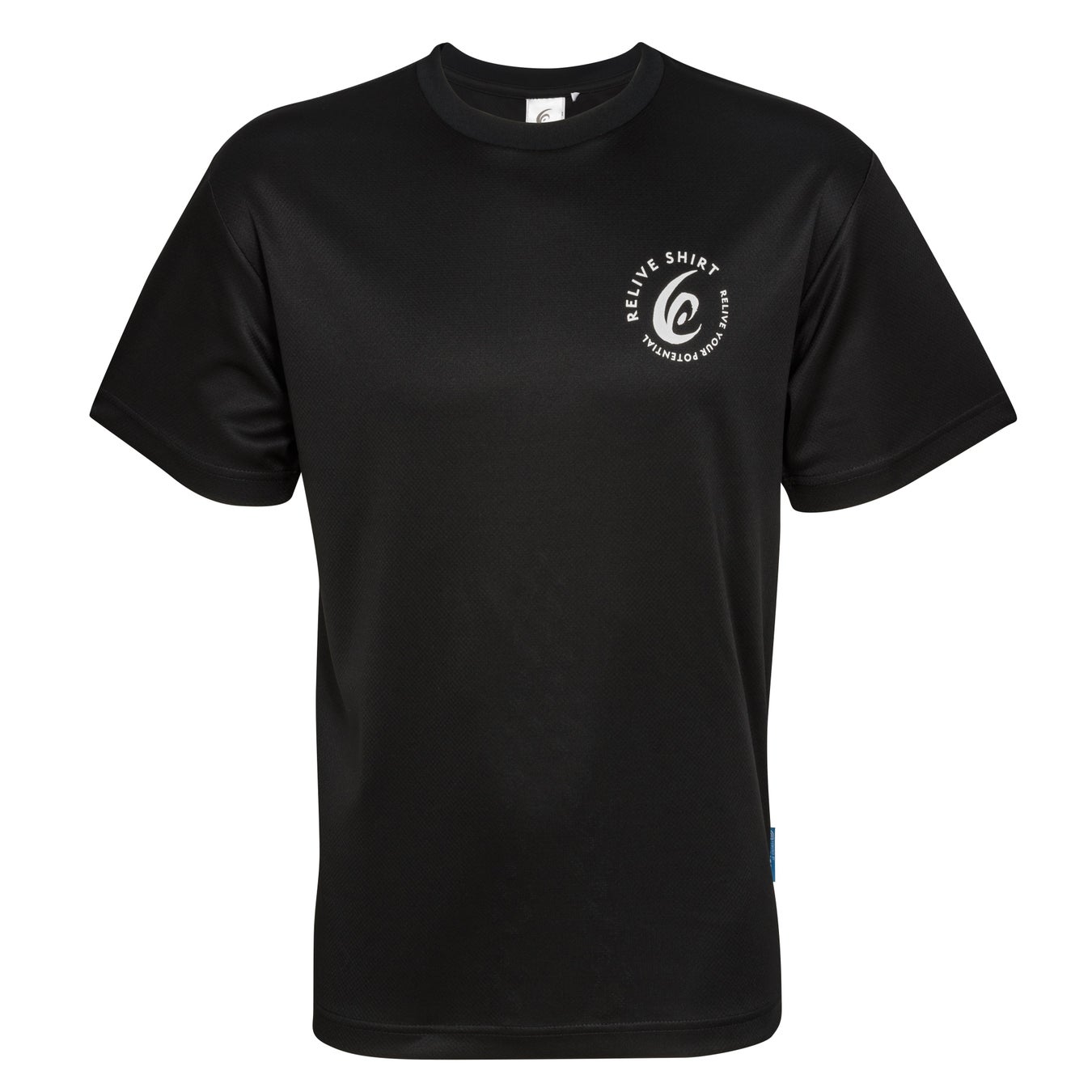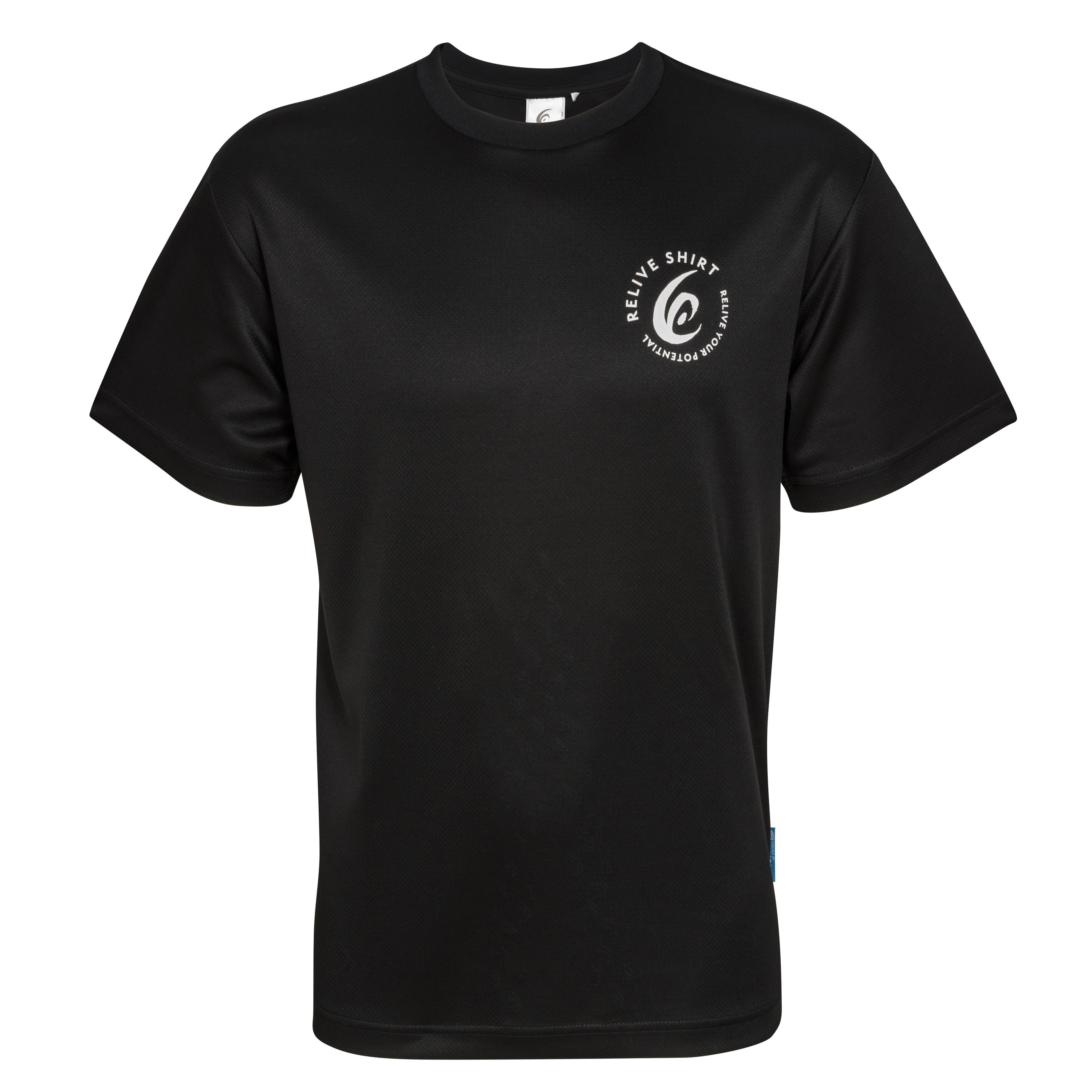 リライブウェアは遠赤外線を輻射し、着用するだけで血行を促進します。特殊な加工を施した複数の鉱石をインクに練り込み、身体のポイントに沿ってプリント加工する「リライブ加工」が特徴です。