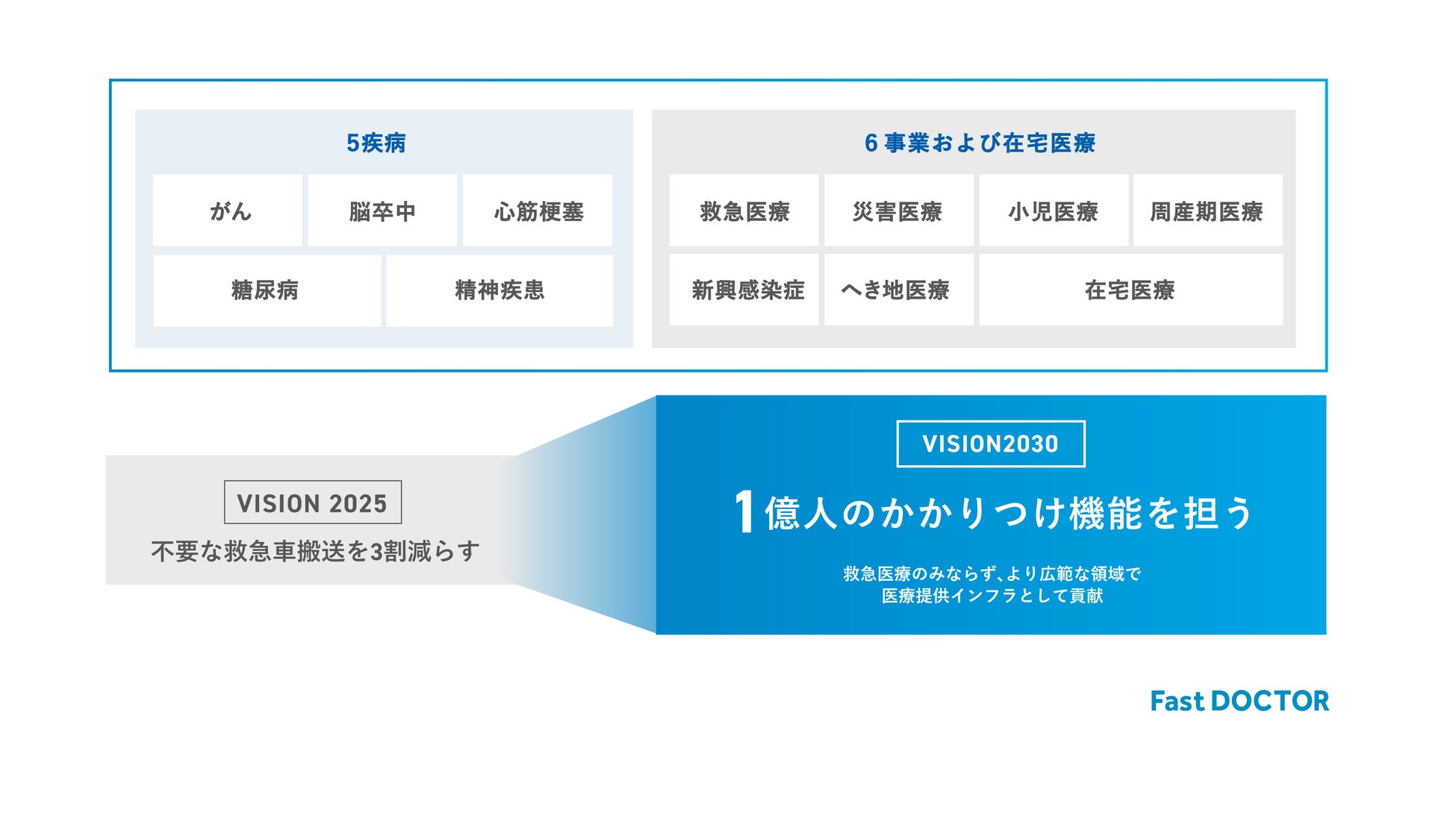 ファストドクターは医療提供体制の確保が必要とされる「5疾病6事業および在宅医療」に対応するサービスをプラットフォーム内に拡充し、医療アクセスが困難となる夜間・休日対応を基軸として急性期から慢性期まで幅広く支援しています。2021年には「在宅医療支援サービス」を開始し、24時間体制の構築に必要な医療リソースや機能を備え、医療機関と夜間休日と日中平日の分業・連携体制を築くことで、在宅医療体制の強化と持続可能性の実現に貢献できると考えています。ファストドクターは今後もプラットフォームを通じて、ビジョン「1億人のかかりつけ機能を担う」、ミッション「生活者の不安と、医療者の負担をなくす」の実現を目指してまいります。