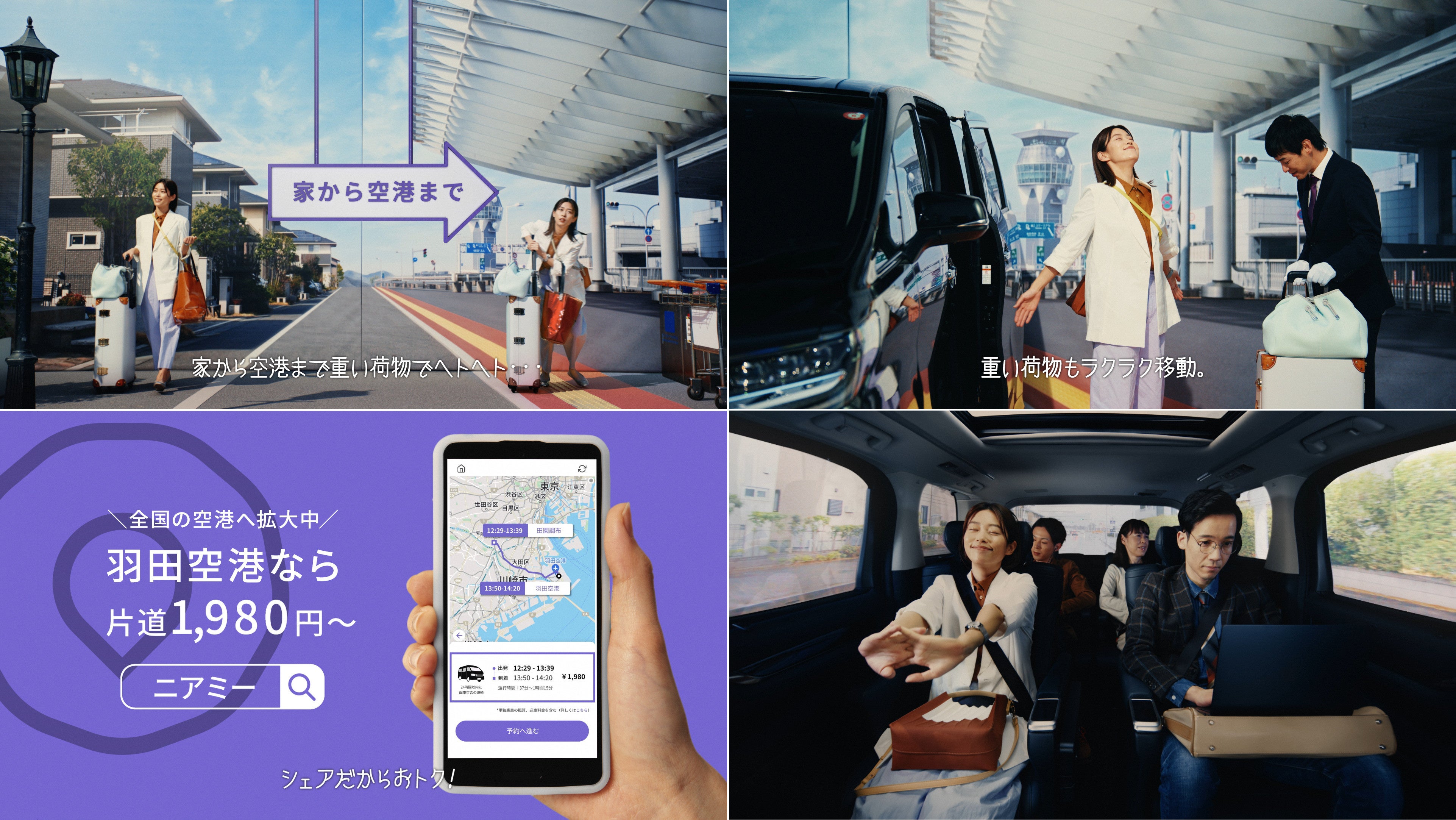 その後、利用者同士がシェアしている移動中のタクシーに場面が転換。「シェアだからおトク!」というコメントとともに、「nearMe.Airport」が全国の空港へサービス拡大中であることと、羽田空港なら片道料金1,980円から利用できることについて説明しています。