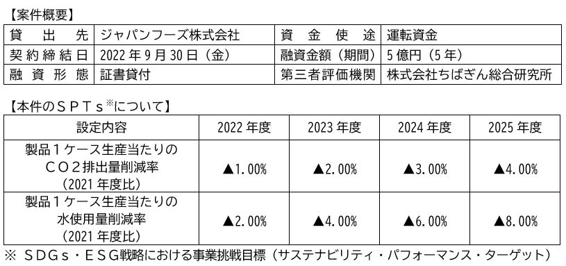 千葉銀行(頭取 米本 努)は、2022年9月30日(金)、ジャパンフーズ株式会社(代表取締役社長 細井 富夫、本社:千葉県長生郡長柄町)に対して、「ちばぎんSDGsリーダーズローン(サステナビリティ・リンク・ローン型)」を取り組みましたのでお知らせします。