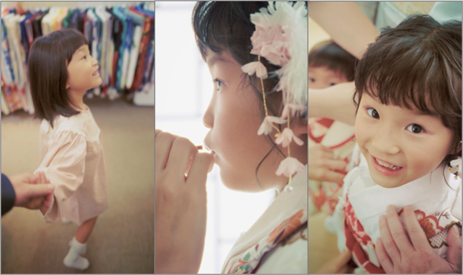 この度のWebCMでは七五三撮影という特別な日に見せる、普段とは少し違ったお子さまの表情を切り取り、その様子にハッとしたり、寄り添ったりする親の気持ちを言葉にして映像化しました。各出演者には、入店、ヘアセット、着物選び、お着がえ、撮影といった実際の行程を体験してもらいました。一種のドキュメンタリーとして現場のライブ感は大切に、緊張したり、戸惑ってしまったり、泣いてしまったりといった状況も受け入れ、その中で、それぞれのご両親が今まで見たことのないお子さまのありのままの姿を描きました。
