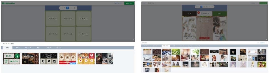 「Lメニュープラス」にはデザイン性の高い30種類以上のテンプレートが用意されています。さらに画像素材も豊富に取り揃えており自由に配置できるため、デザインに自信がなくても外注なしで簡単に美しいリッチメニューが作成できます。