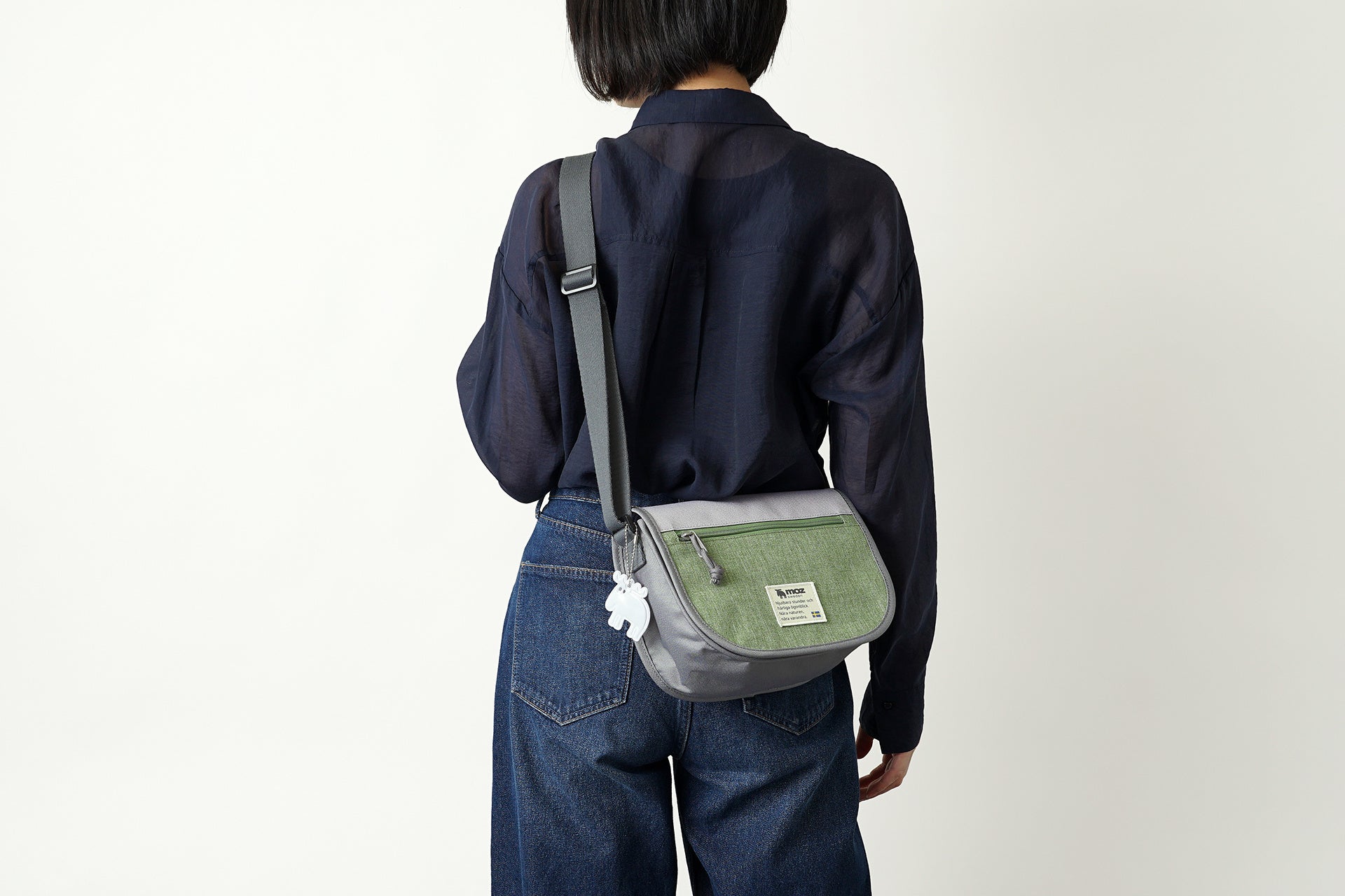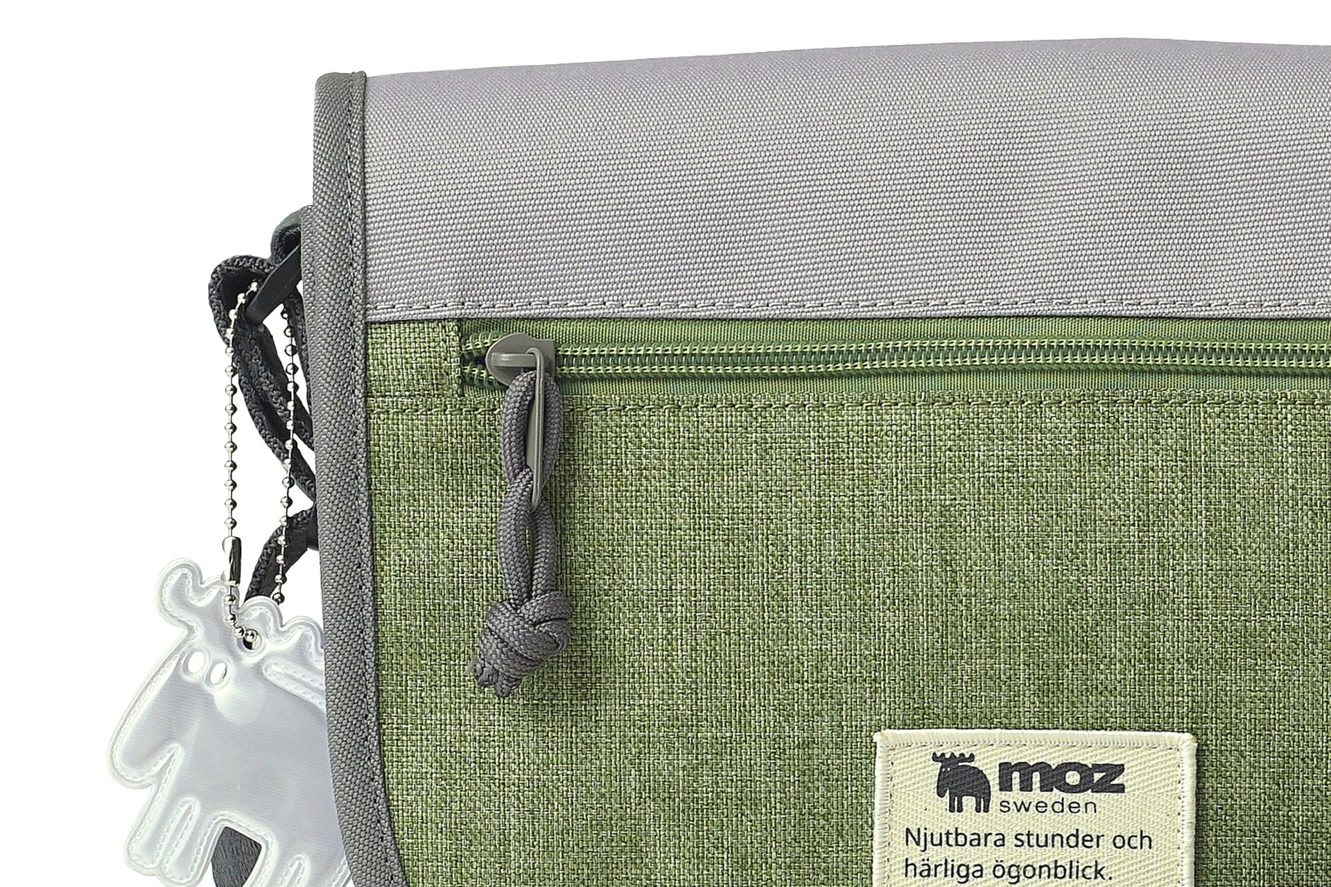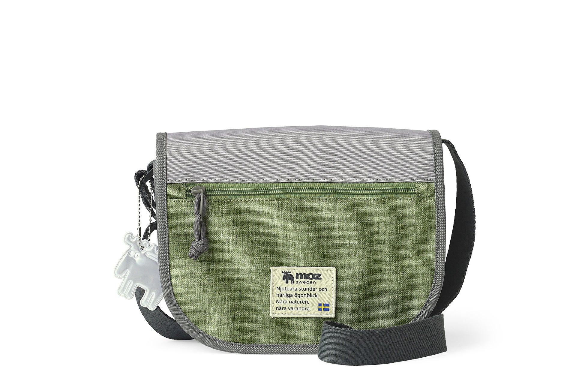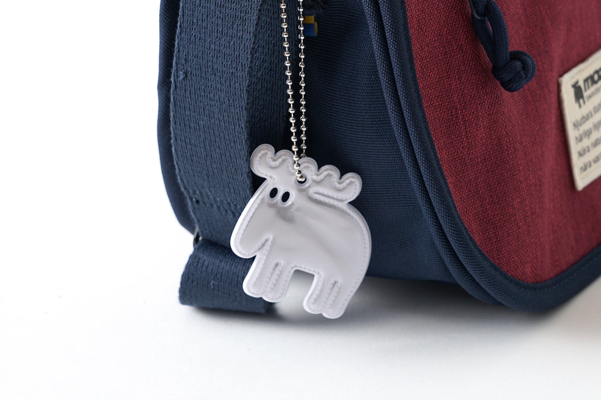 バッグのサイドには、mozのアイコンである「エルク」を象ったリフレクトチャームが付属しています。光を反射する素材を使用しているため、デザインのアクセントとしてはもちろん、夜間の歩行や自転車移動の際の視認性を高めてくれる