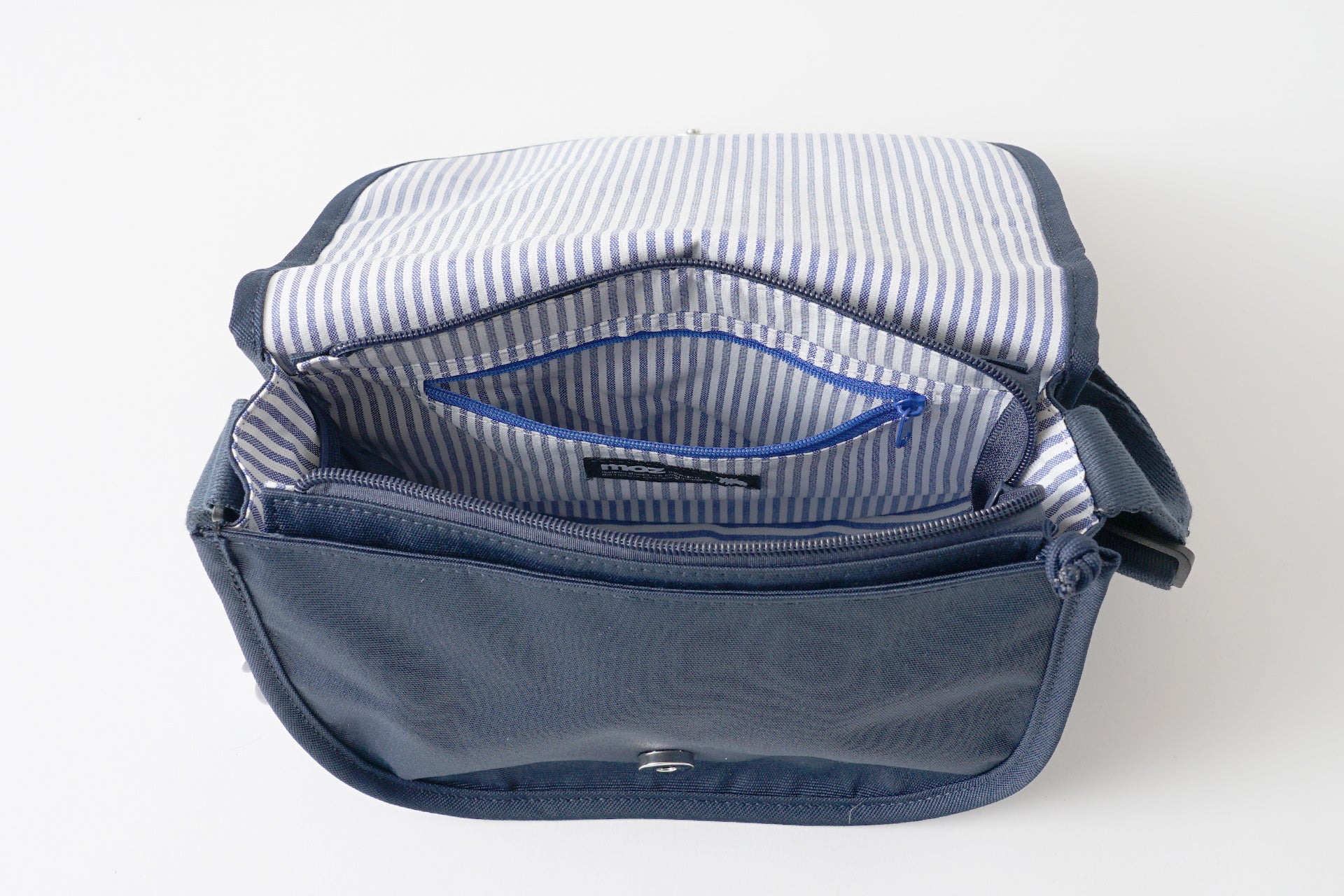 バッグ内部には、仕分けに便利なファスナーポケットとオープンポケットを完備。小物が迷子にならず、快適に整理が行えます。 さらに、内生地には爽やかなブルーのストライプ柄を採用。心が弾む可愛らしさだけでなく、中を明るく照らすことで、奥にある荷物が見つけやすいという実用性も備えています。
